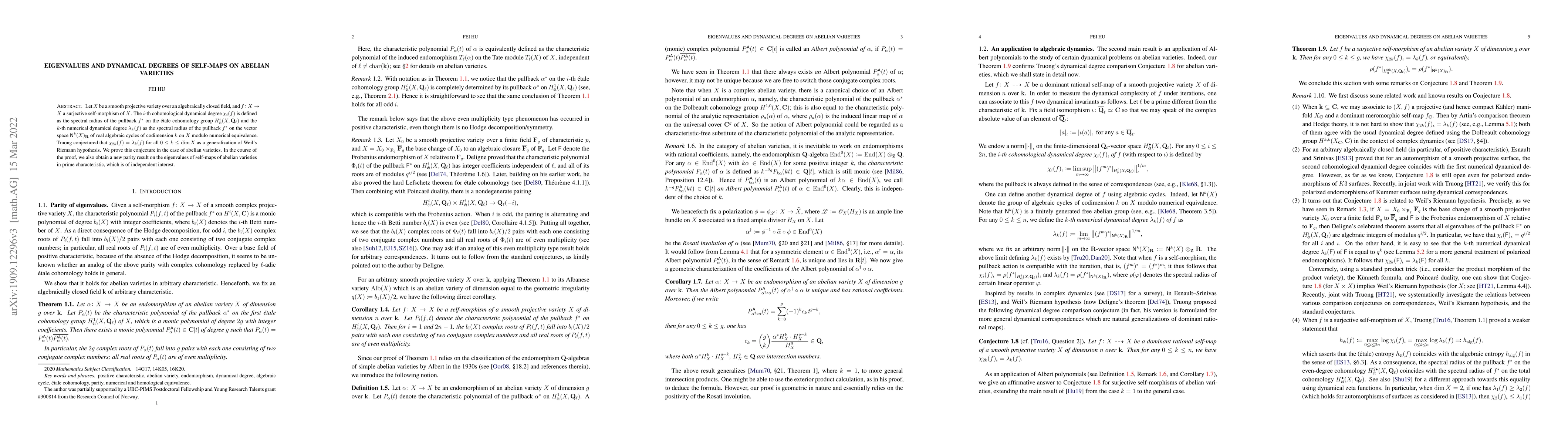 This paper proves Truong's conjecture that the $i$-th cohomological dynamical degree equals the $k$-th numerical dynamical degree for abelian varieties, extending results from Weil's Riemann hypothesis. Additionally, it presents a new parity result concerning the eigenvalues of self-maps on abelian varieties in prime characteristic.