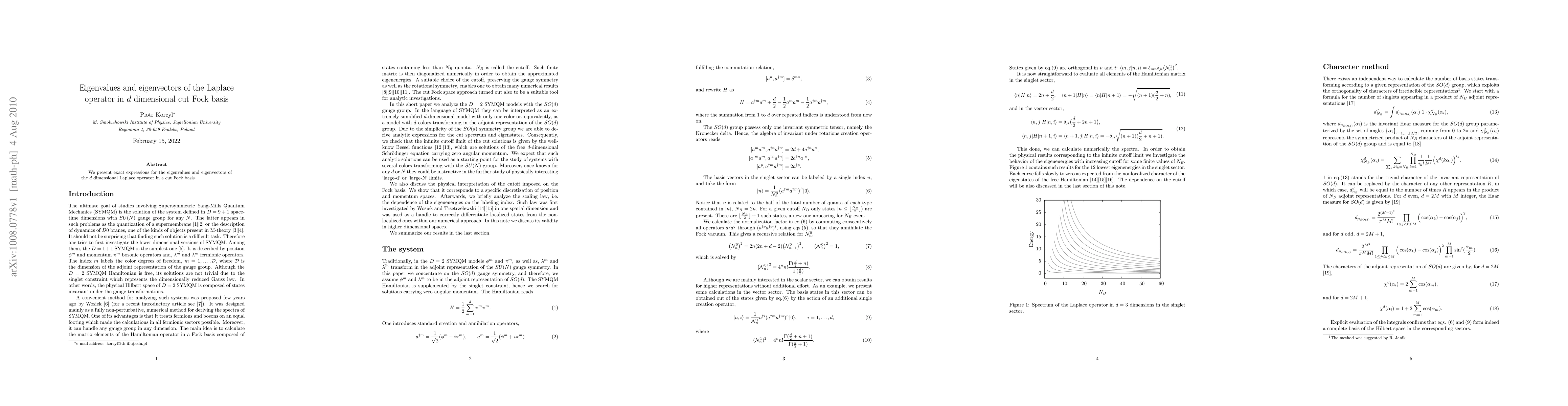 Summary: This paper provides precise formulas for the eigenvalues and eigenvectors of the Laplace operator in a d-dimensional cut Fock basis, offering a comprehensive analytical solution for this mathematical problem.