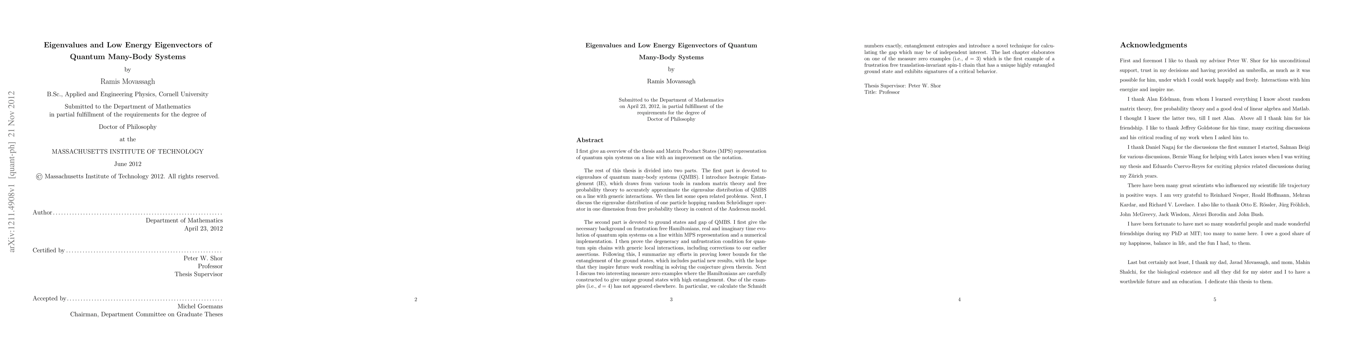 I first give an overview of the thesis and Matrix Product States (MPS) representation of quantum spin chains with an improvement on the conventional notation. The rest of this thesis is divided into two parts. The first part is devoted to eigenvalues of quantum many-body systems (QMBS). I introduce Isotropic Entanglement, which draws from various tools in random matrix theory and free probability theory (FPT) to accurately approximate the eigenvalue distribution of QMBS on a line with generic interactions. Next, I discuss the energy distribution of one particle hopping random Schr\"odinger operator in 1D from FPT in context of the Anderson model. The second part is devoted to ground states and gap of QMBS. I first give the necessary background on frustration free (FF) Hamiltonians, real and imaginary time evolution within MPS representation and a numerical implementation. I then prove the degeneracy and FF condition for quantum spin chains with generic local interactions, including corrections to our earlier assertions. I then summarize my efforts in proving lower bounds for the entanglement of the ground states, which includes some new results, with the hope that they inspire future work resulting in solving the conjecture given therein. Next I discuss two interesting measure zero examples where FF Hamiltonians are carefully constructed to give unique ground states with high entanglement. One of the examples (i.e., $d=4$) has not appeared elsewhere. In particular, we calculate the Schmidt numbers exactly, entanglement entropies and introduce a novel technique for calculating the gap which may be of independent interest. The last chapter elaborates on one of the measure zero examples (i.e., $d=3$) which is the first example of a FF translation-invariant spin-1 chain that has a unique highly entangled ground state and exhibits signatures of a critical behavior.