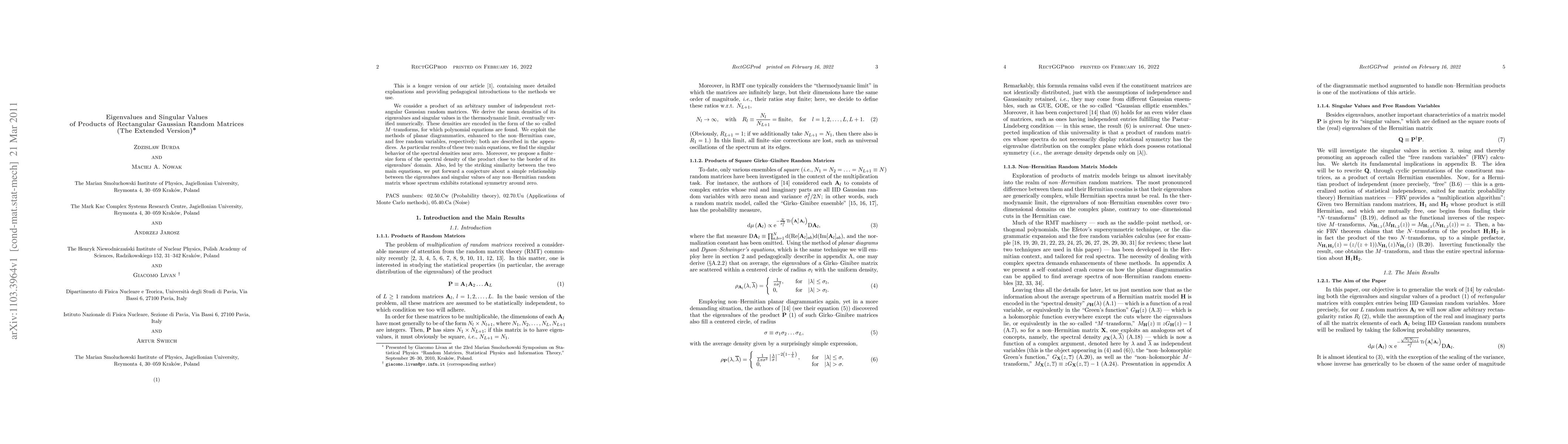 This paper derives mean densities of eigenvalues and singular values for products of independent rectangular Gaussian random matrices in the thermodynamic limit, employing planar diagrammatics and free random variables. It finds singular behavior near zero and proposes a finite-size spectral density conjecture, suggesting a relationship between eigenvalues and singular values for non-Hermitian matrices with rotational symmetry.