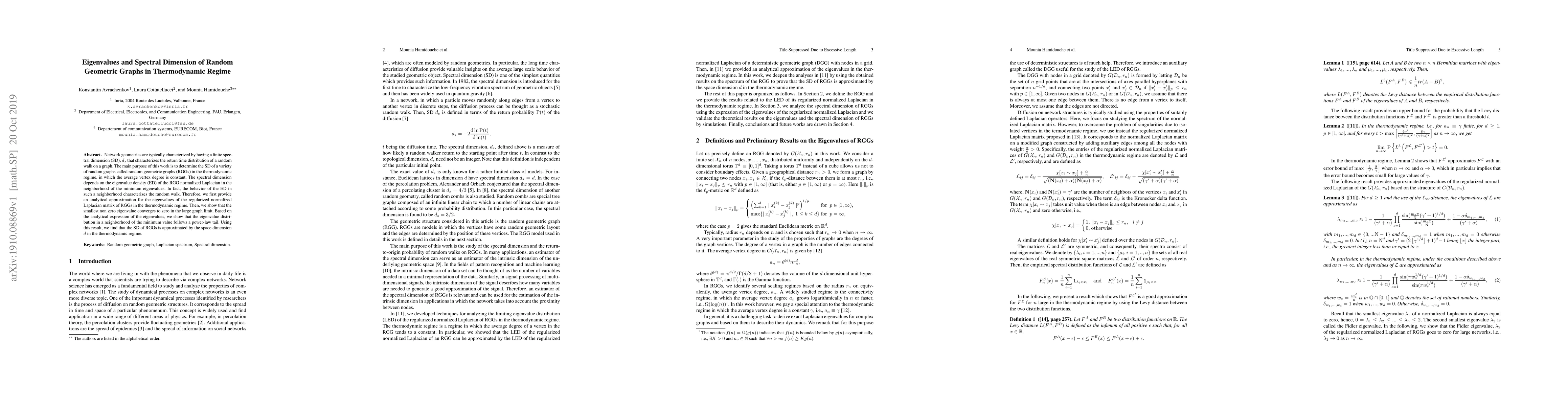 Network geometries are typically characterized by having a finite spectral dimension (SD), $d_{s}$ that characterizes the return time distribution of a random walk on a graph. The main purpose of this work is to determine the SD of a variety of random graphs called random geometric graphs (RGGs) in the thermodynamic regime, in which the average vertex degree is constant. The spectral dimension depends on the eigenvalue density (ED) of the RGG normalized Laplacian in the neighborhood of the minimum eigenvalues. In fact, the behavior of the ED in such a neighborhood characterizes the random walk. Therefore, we first provide an analytical approximation for the eigenvalues of the regularized normalized Laplacian matrix of RGGs in the thermodynamic regime. Then, we show that the smallest non zero eigenvalue converges to zero in the large graph limit. Based on the analytical expression of the eigenvalues, we show that the eigenvalue distribution in a neighborhood of the minimum value follows a power-law tail. Using this result, we find that the SD of RGGs is approximated by the space dimension $d$ in the thermodynamic regime.