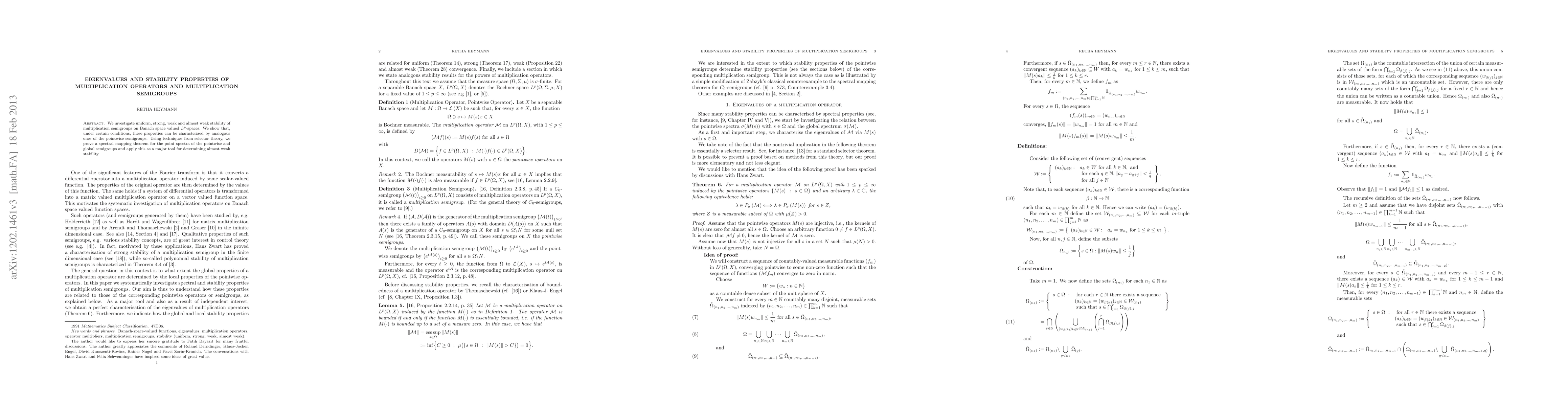 This paper examines various stability properties of multiplication semigroups on Banach space valued $L^p$-spaces, demonstrating that these properties can be characterized by those of associated pointwise semigroups under specific conditions. The authors employ selector theory and a spectral mapping theorem to determine almost weak stability.