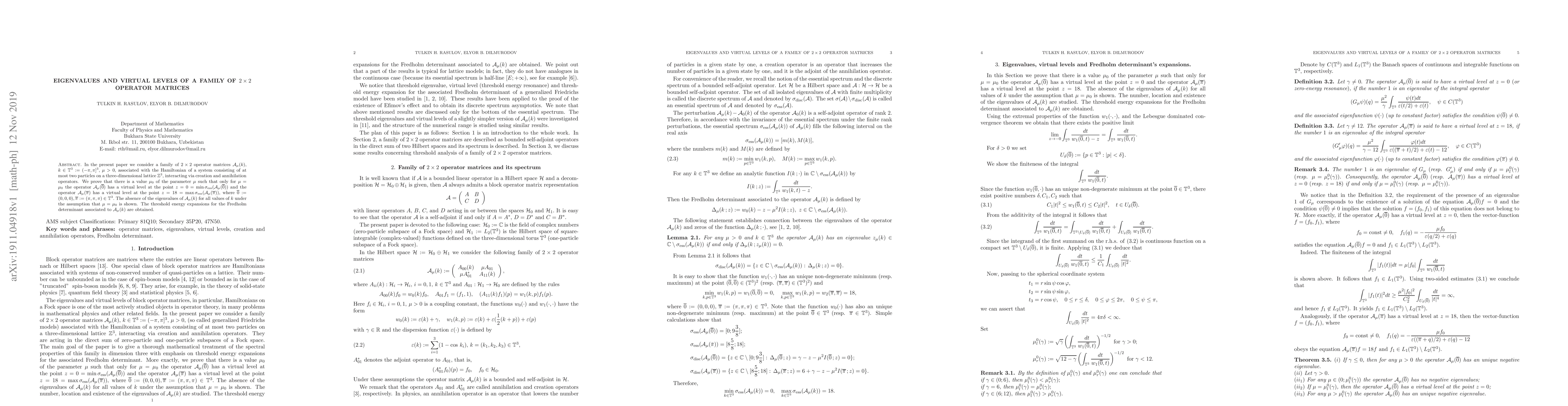 Researchers found a threshold value for parameter ΰ that makes specific 2x2 operator matrices have virtual levels at distinct points, and showed the expansion of the Fredholm determinant associated with these operators.