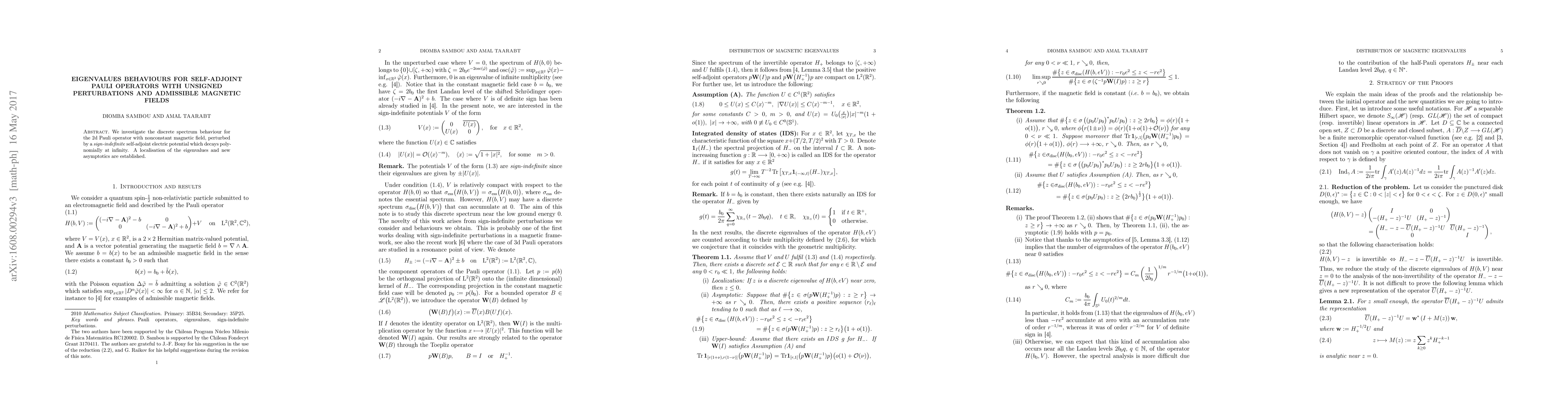 Summary: This paper examines the eigenvalue behaviors of two-dimensional Pauli operators under perturbations by a sign-indefinite electric potential and nonconstant magnetic fields, establishing new asymptotic eigenvalue results.