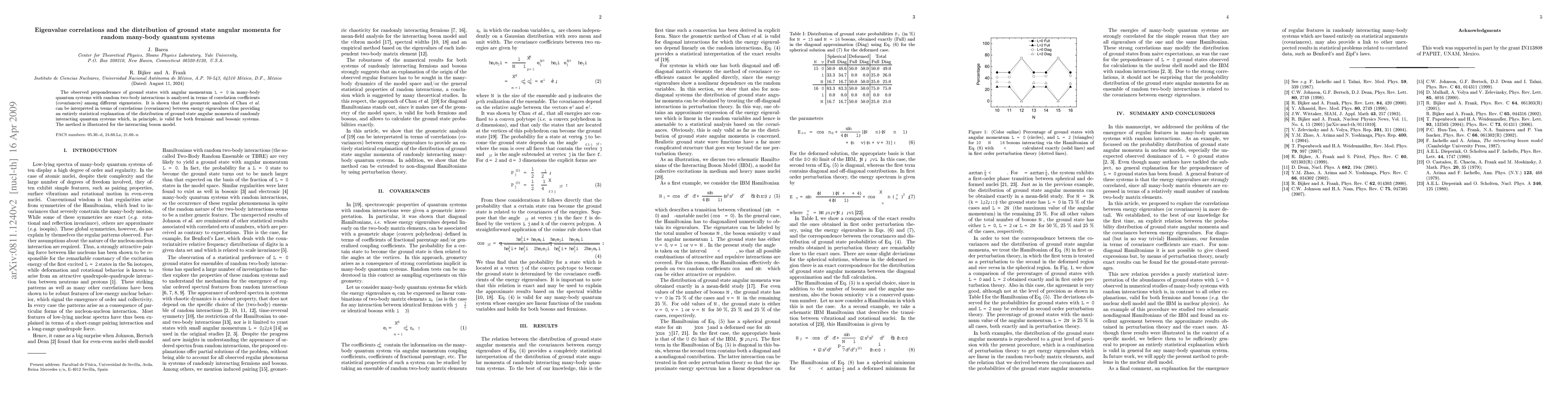This paper explores the statistical explanation for the prevalence of ground states with zero angular momentum in random many-body quantum systems through correlations between energy eigenvalues. It demonstrates that the geometric analysis of Chau et al. can be interpreted via these correlations, providing a universal statistical framework for understanding the angular momentum distribution in both fermionic and bosonic systems, illustrated using the interacting boson model.