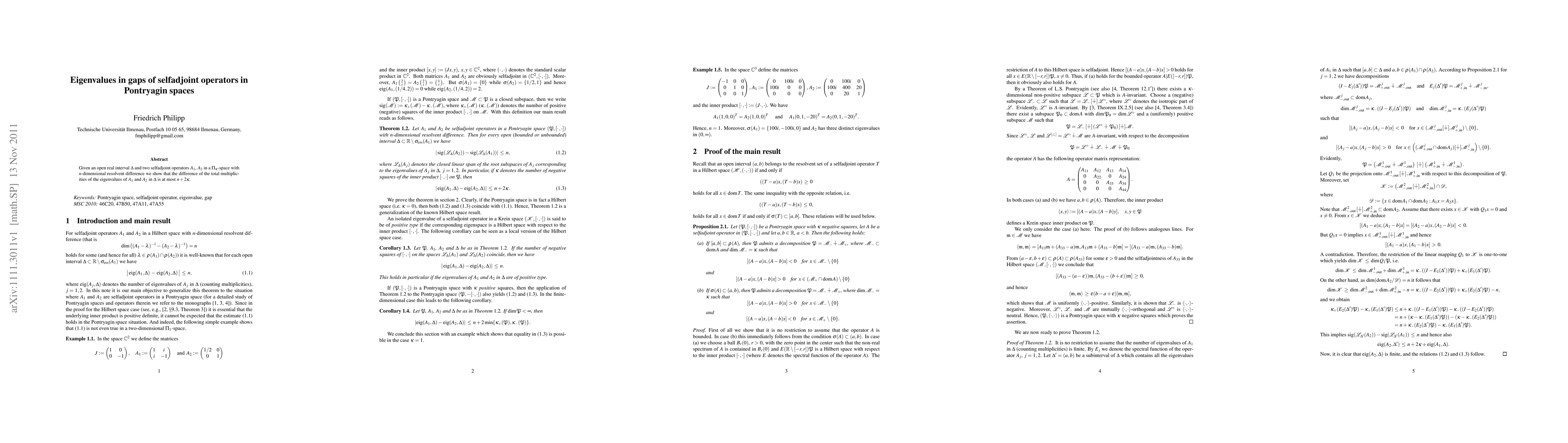 The paper presents a theorem and its proof detailing the bound on the difference in eigenvalue multiplicities for selfadjoint operators in Pontryagin spaces, along with corollaries that provide additional insights into eigenvalue distribution.