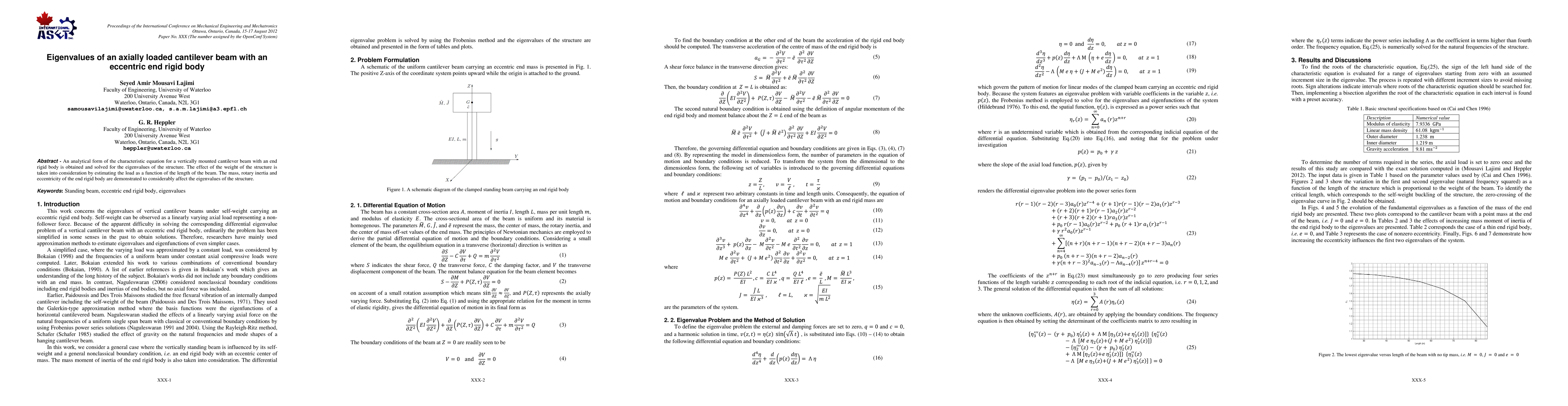 An analytical form of the characteristic equation for a vertically mounted cantilever beam with an end rigid body is obtained and solved for the eigenvalues of the structure. The effect of the weight of the structure is taken into consideration by estimating the load as a function of the length of the beam. The mass, rotary inertia and eccentricity of the end rigid body are demonstrated to considerably affect the eigenvalues of the structure.