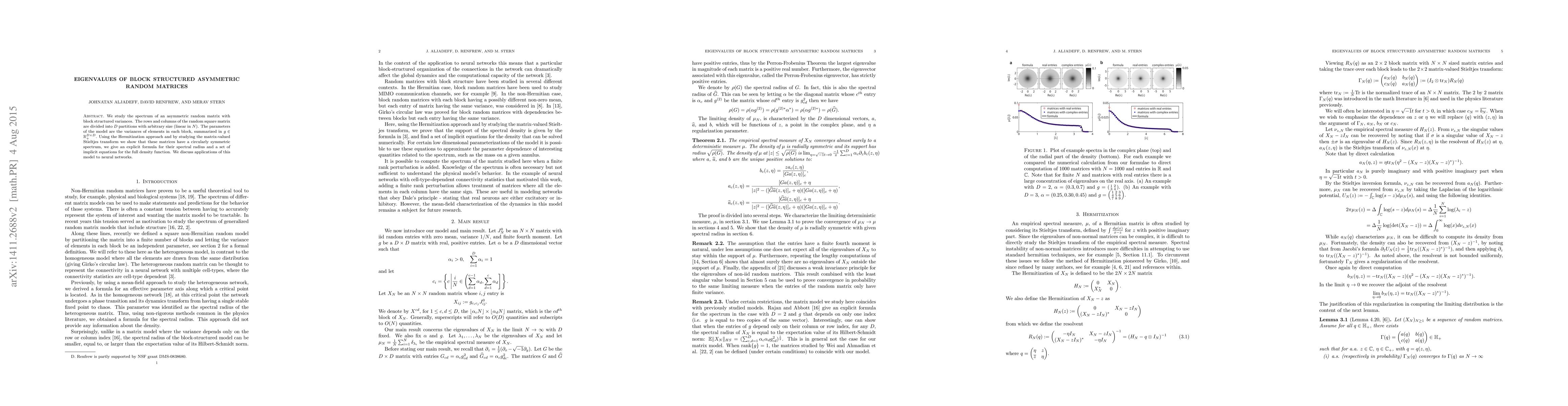 Researchers studied the spectrum of asymmetric random matrices with block structured variances, finding they have a circularly symmetric spectrum and an explicit formula for spectral radius.