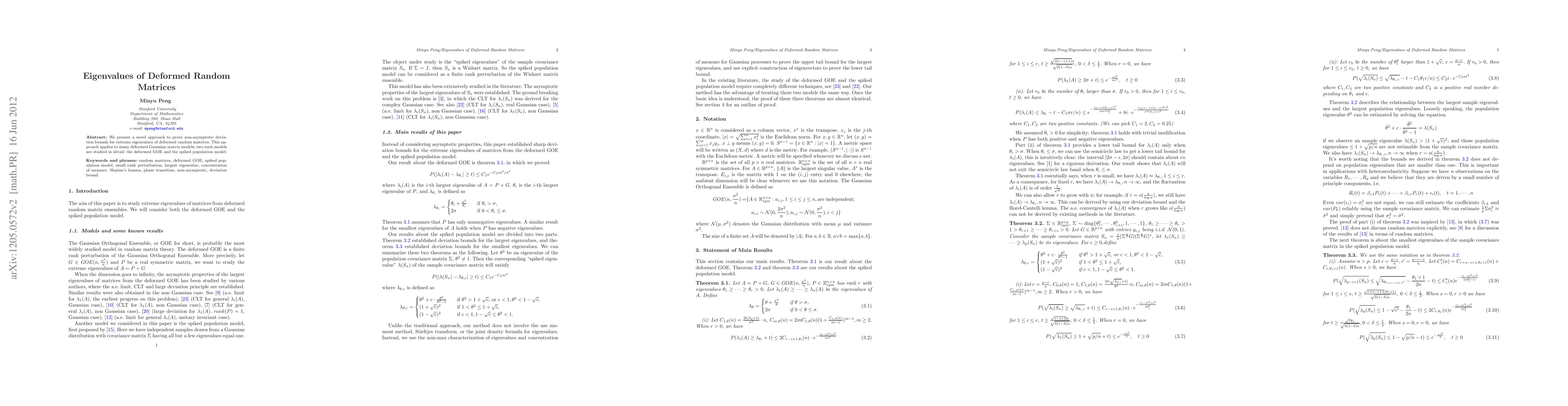 This paper introduces a new methodology for analyzing the eigenvalues of deformed random matrices, focusing on detailed examinations of the deformed Gaussian Orthogonal Ensemble (GOE) and the spiked population model.