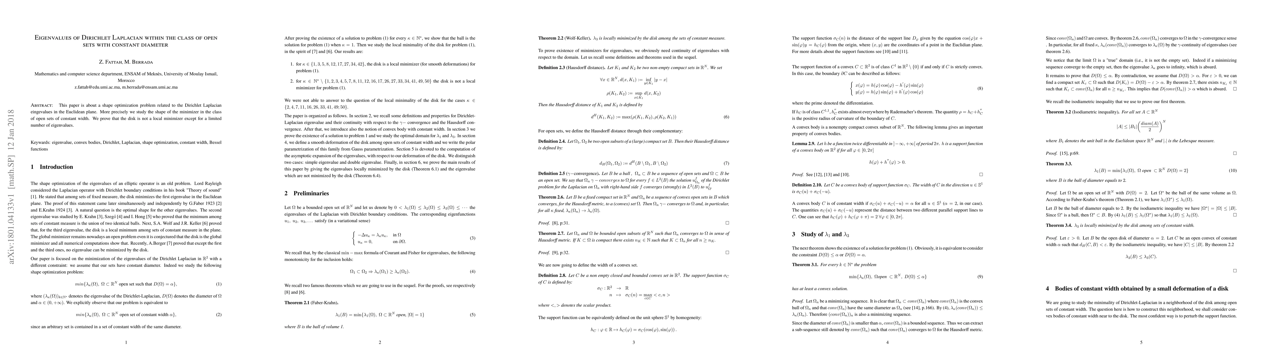 Researchers investigated how shapes with constant diameter minimize the Dirichlet Laplacian eigenvalues in the Euclidean plane. They found that only a limited number of disk shapes qualify as local minima.