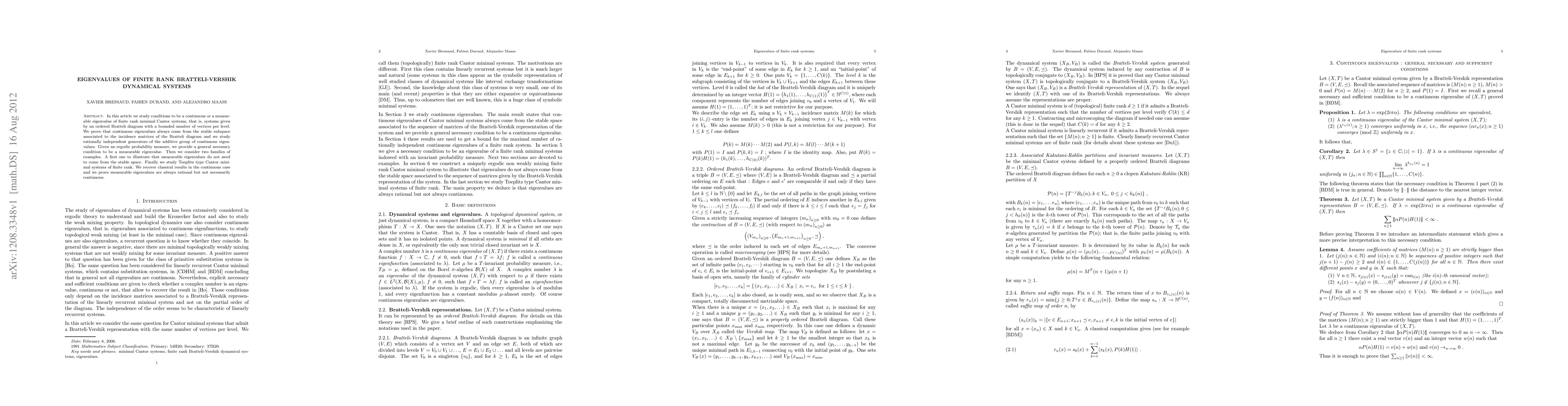 This paper studies conditions for eigenvalues in finite rank Bratteli-Vershik dynamical systems, finding that continuous eigenvalues come from stable subspaces and measurable eigenvalues require specific probability measures.