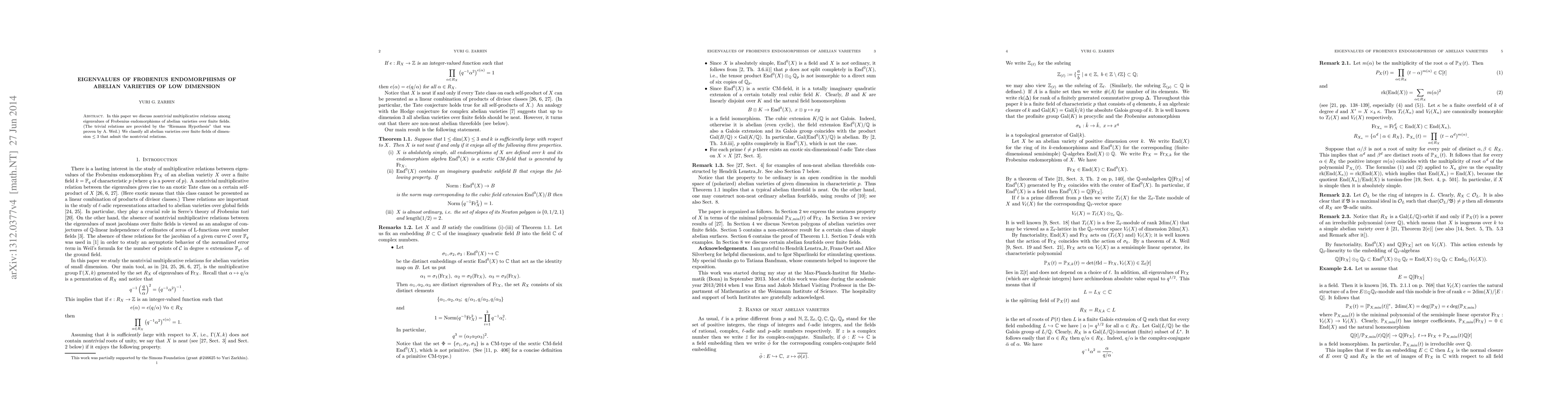 Summary: This paper explores multiplicative relationships among the eigenvalues of Frobenius endomorphisms for low-dimensional abelian varieties over finite fields, providing insights into their algebraic structure.