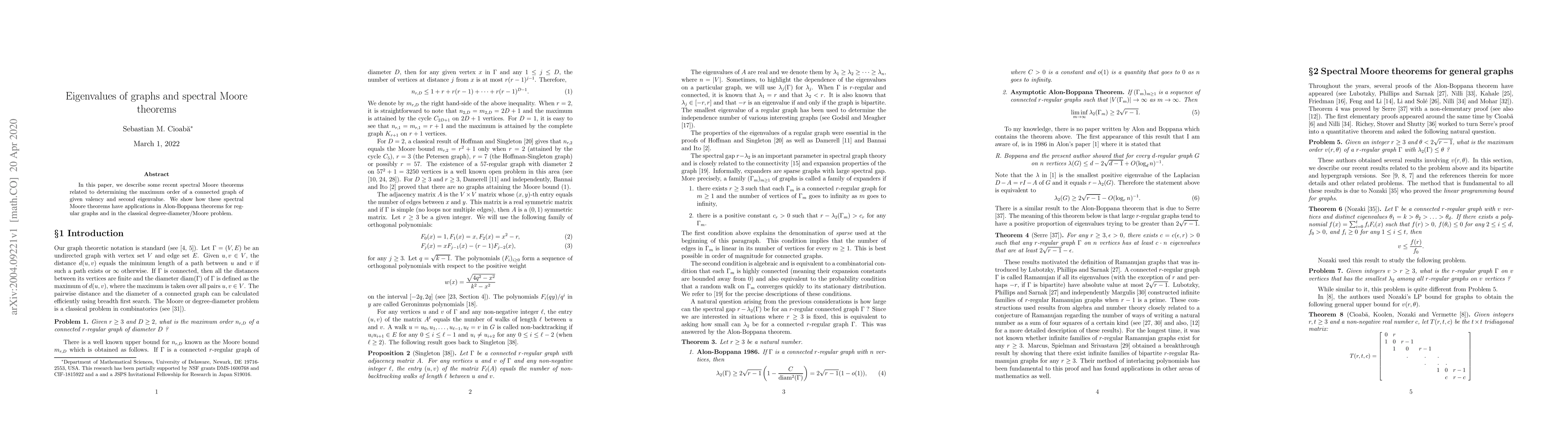 This paper explores recent spectral Moore theorems that determine the maximum order of connected graphs with specified valency and second eigenvalue, and demonstrates their applications in Alon-Boppana theorems for regular graphs and the classical degree-diameter/Moore problem.