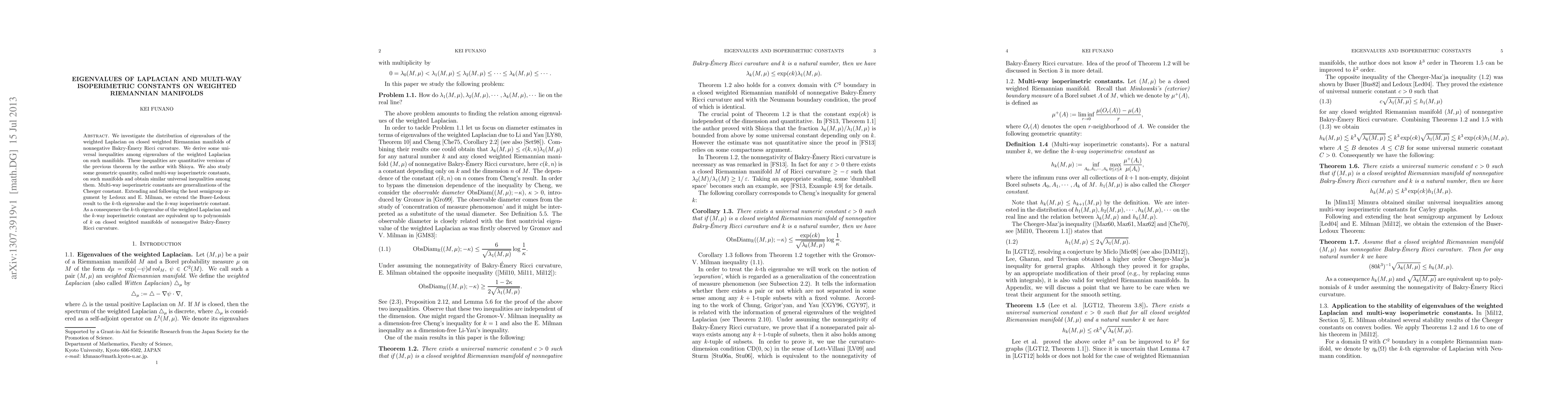 This paper investigates the eigenvalues of the weighted Laplacian on closed weighted Riemannian manifolds with nonnegative Bakry-Emery Ricci curvature, deriving universal inequalities among these eigenvalues. It also explores multi-way isoperimetric constants, generalizing the Cheeger constant, and establishes similar inequalities, ultimately showing equivalence between the $k$-th eigenvalue and the $k$-way isoperimetric constant up to polynomial factors.