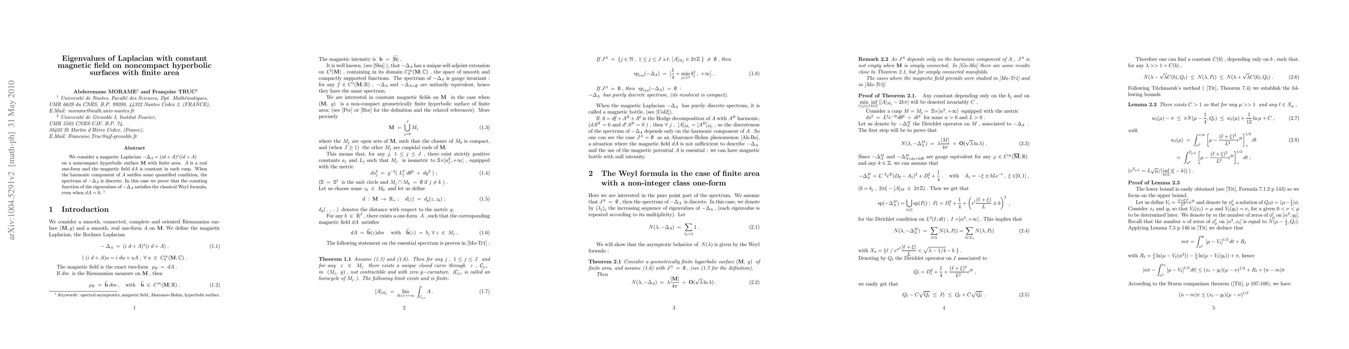 We consider a magnetic Laplacian $-\Delta_A=(id+A)^\star (id+A)$ on a noncompact hyperbolic surface $\mM $ with finite area. $A$ is a real one-form and the magnetic field $dA$ is constant in each cusp. When the harmonic component of $A$ satifies some quantified condition, the spectrum of $-\Delta_A$ is discrete. In this case we prove that the counting function of the eigenvalues of $-\Delta_{A}$ satisfies the classical Weyl formula, even when $dA=0. $
