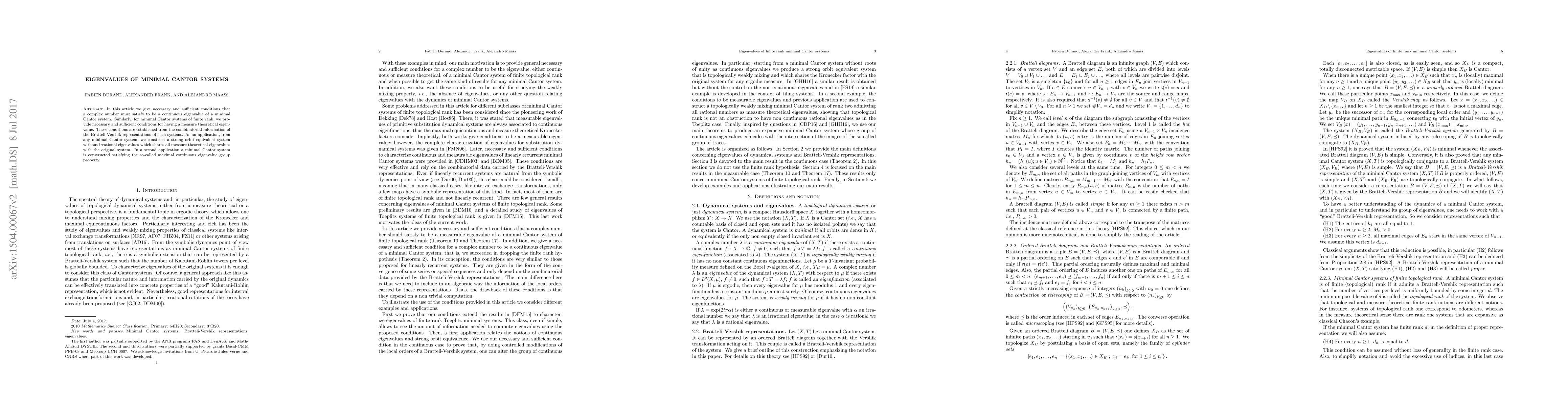 This paper establishes necessary and sufficient conditions for complex numbers to be continuous eigenvalues of minimal Cantor systems and provides similar conditions for measure theoretical eigenvalues based on combinatorial data from Bratteli-Vershik representations. It also constructs a system without irrational eigenvalues that retains all measure theoretical eigenvalues and builds a minimal Cantor system with the maximal continuous eigenvalue group property.