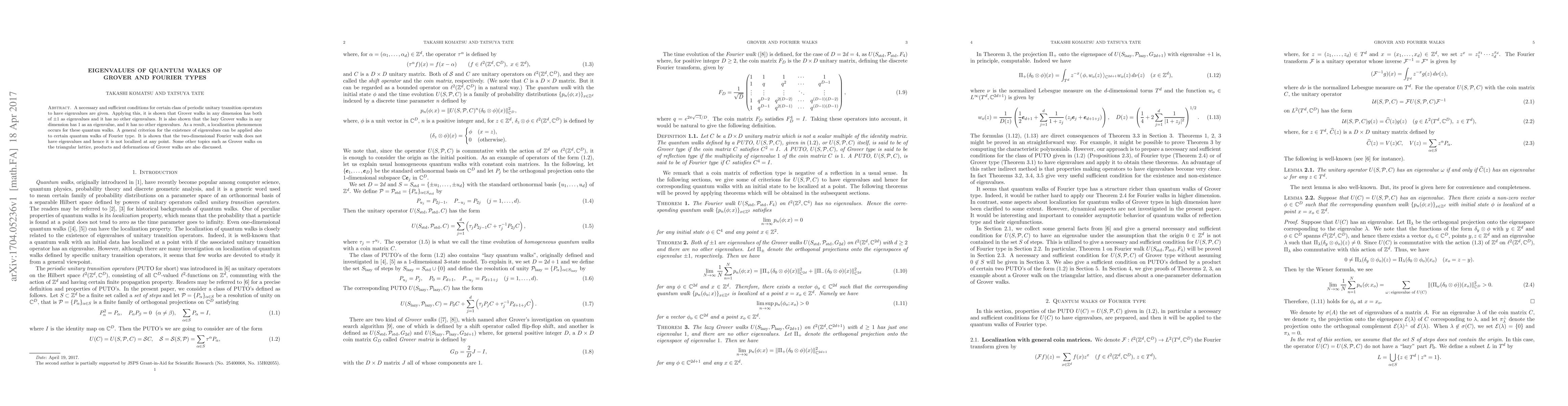 A necessary and sufficient conditions for certain class of periodic unitary transition operators to have eigenvalues are given. Applying this, it is shown that Grover walks in any dimension has both of $\pm 1$ as eigenvalues and it has no other eigenvalues. It is also shown that the lazy Grover walks in any dimension has $1$ as an eigenvalue, and it has no other eigenvalues. As a result, a localization phenomenon occurs for these quantum walks. A general criterion for the existence of eigenvalues can be applied also to certain quantum walks of Fourier type. It is shown that the two-dimensional Fourier walk does not have eigenvalues and hence it is not localized at any point. Some other topics such as Grover walks on the triangular lattice, products and deformations of Grover walks are also discussed.