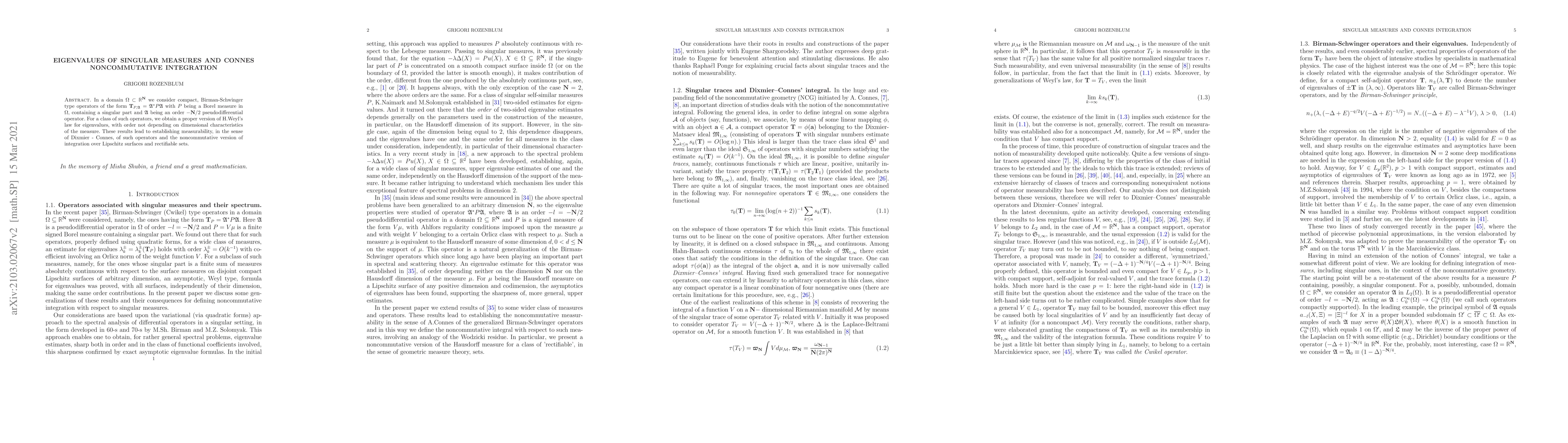 This paper establishes eigenvalue asymptotics for a class of compact operators involving singular measures and pseudodifferential operators, leading to noncommutative integration and measurability in the sense of A.Connes.