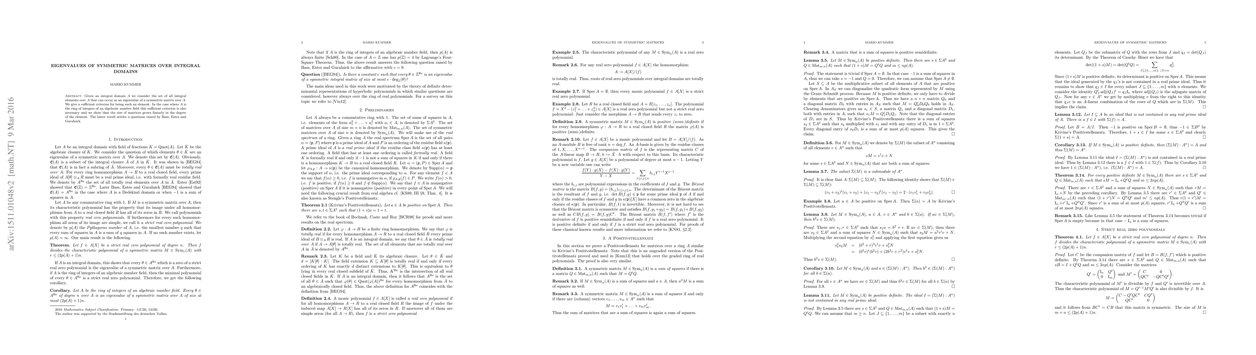 Given an integral domain A we consider the set of all integral elements over A that can occur as an eigenvalue of a symmetric matrix over A. We give a sufficient criterion for being such an element. In the case where A is the ring of integers of an algebraic number field this sufficient criterion is also necessary and we show that the size of matrices grows linearly in the degree of the element. The latter result settles a questions raised by Bass, Estes and Guralnick.