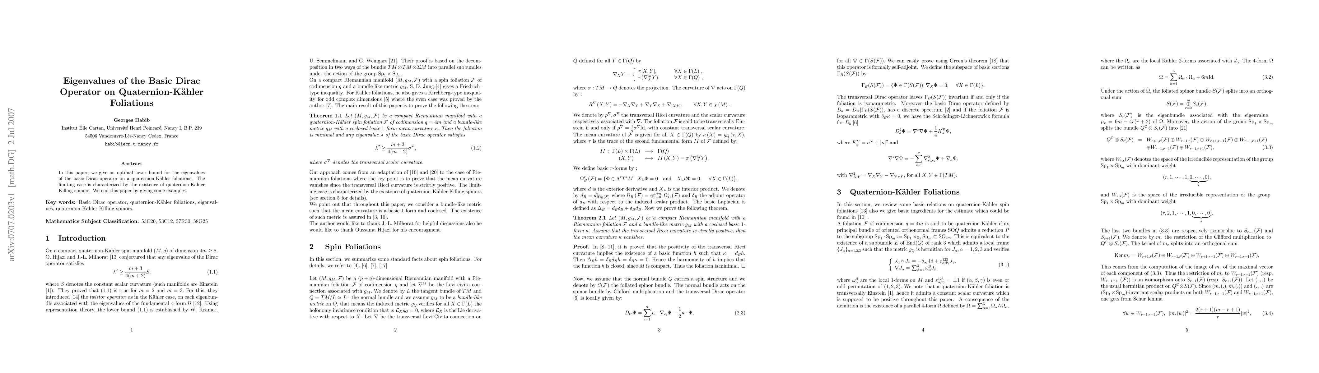 This paper provides an optimal lower bound for the eigenvalues of the basic Dirac operator on quaternion-Kahler foliations, identifying the limiting case through the presence of quaternion-Kahler Killing spinors, and concludes with illustrative examples.