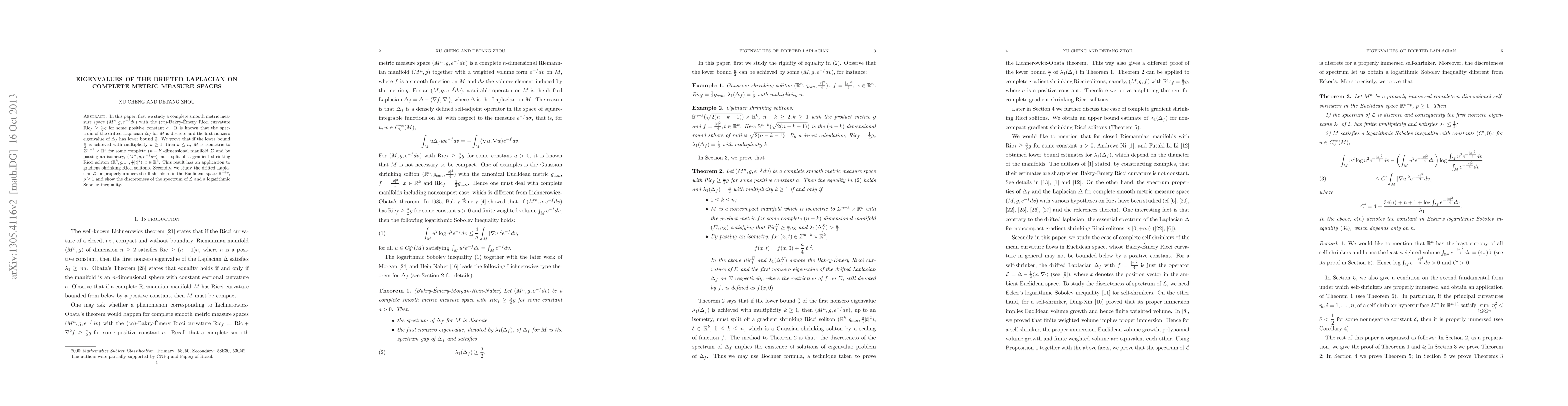 I In this paper, first we study a complete smooth metric measure space $(M^n,g, e^{-f}dv)$ with the ($\infty$)-Bakry-\'Emery Ricci curvature $\textrm{Ric}_f\ge \frac a2g$ for some positive constant $a$. It is known that the spectrum of the drifted Laplacian $\Delta_f$ for $M$ is discrete and the first nonzero eigenvalue of $\Delta_f$ has lower bound $\frac a2$. We prove that if the lower bound $\frac a2$ is achieved with multiplicity $k\geq 1$, then $k\leq n$, $M$ is isometric to $\Sigma^{n-k}\times \mathbb{R}^k$ for some complete $(n-k)$-dimensional manifold $\Sigma$ and by passing an isometry, $(M^n,g, e^{-f}dv)$ must split off a gradient shrinking Ricci soliton $(\mathbb{R}^k, g_{can}, \frac{a}{4}|t|^2)$, $t\in \mathbb{R}^k$. This result has an application to gradient shrinking Ricci solitons. Secondly, we study the drifted Laplacian $\mathcal{L}$ for properly immersed self-shrinkers in the Euclidean space $\mathbb{R}^{n+p}$, $p\geq1$ and show the discreteness of the spectrum of $\mathcal{L}$ and a logarithmic Sobolev inequality.