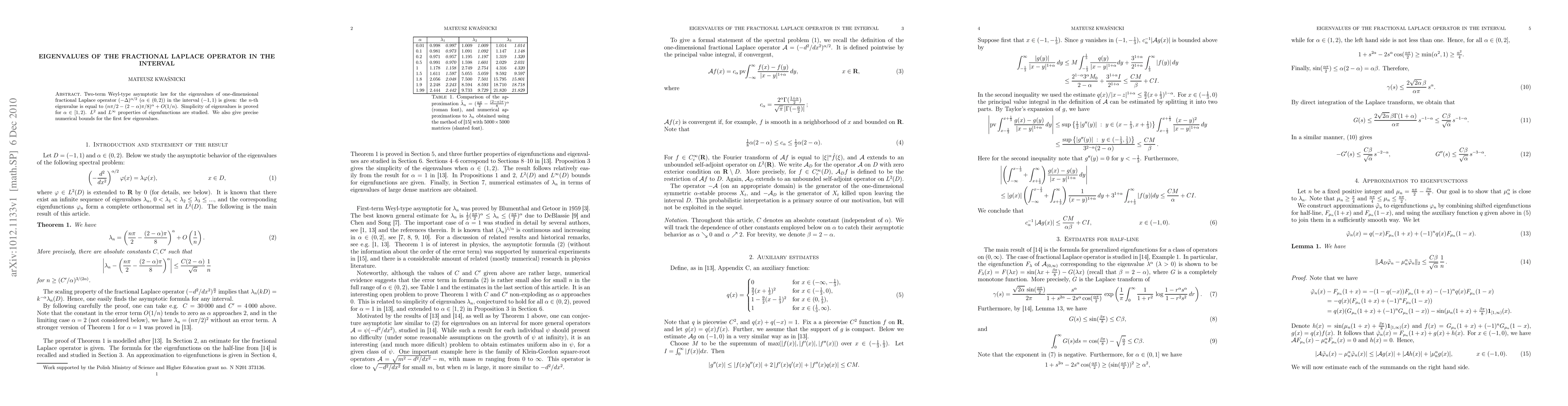 This paper provides a two-term Weyl-type asymptotic formula for the eigenvalues of the one-dimensional fractional Laplace operator in the interval (-1,1), proving simplicity of eigenvalues for 1 ≤ α < 2 and studying the L^2 and L^∞ properties of eigenfunctions. Precise numerical bounds for initial eigenvalues are also presented.