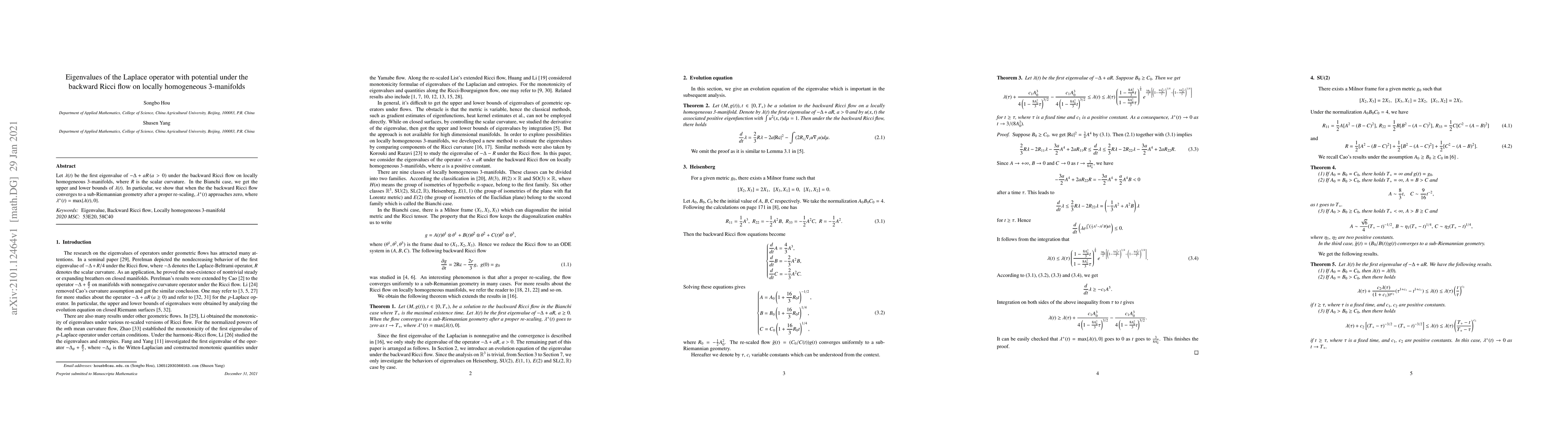 Summary: This paper studies the first eigenvalue $\lambda(t)$ of the Laplace operator with potential under backward Ricci flow on locally homogeneous 3-manifolds. It provides bounds for $\lambda(t)$ in the Bianchi case, showing that $\lambda^{+}(t)$ approaches zero as the flow converges to a sub-Riemannian geometry after rescaling.
