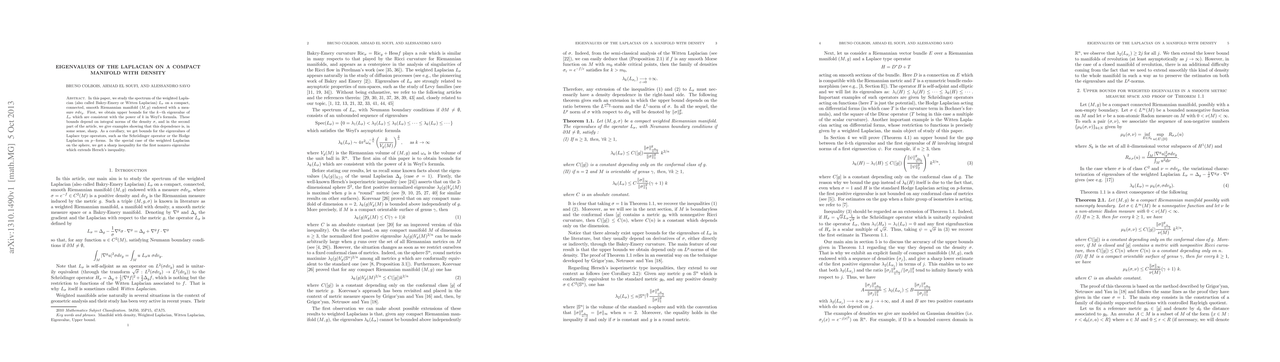 In this paper, we study the spectrum of the weighted Laplacian (also called Bakry-Emery or Witten Laplacian) $L_\sigma$ on a compact, connected, smooth Riemannian manifold $(M,g)$ endowed with a measure $\sigma dv_g$. First, we obtain upper bounds for the $k-$th eigenvalue of $L_{\sigma}$ which are consistent with the power of $k$ in Weyl's formula. These bounds depend on integral norms of the density $\sigma$, and in the second part of the article, we give examples showing that this dependence is, in some sense, sharp. As a corollary, we get bounds for the eigenvalues of Laplace type operators, such as the Schr\"{o}dinger operator or the Hodge Laplacian on $p-$forms. In the special case of the weighted Laplacian on the sphere, we get a sharp inequality for the first nonzero eigenvalue which extends Hersch's inequality.
