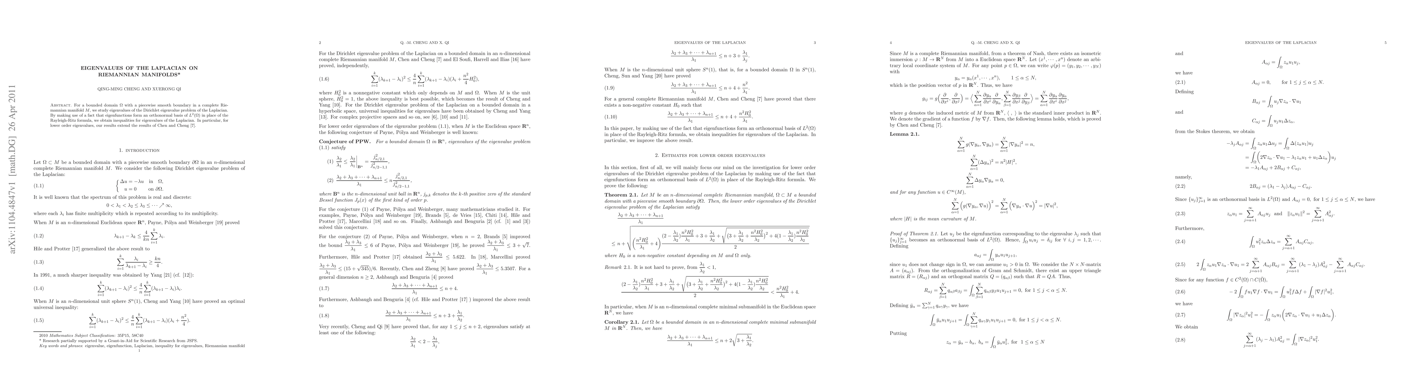 This paper investigates the eigenvalues of the Laplacian on a bounded domain in a Riemannian manifold, deriving inequalities for these eigenvalues using eigenfunctions as an orthonormal basis. The results extend previous findings for lower order eigenvalues by Chen and Cheng.