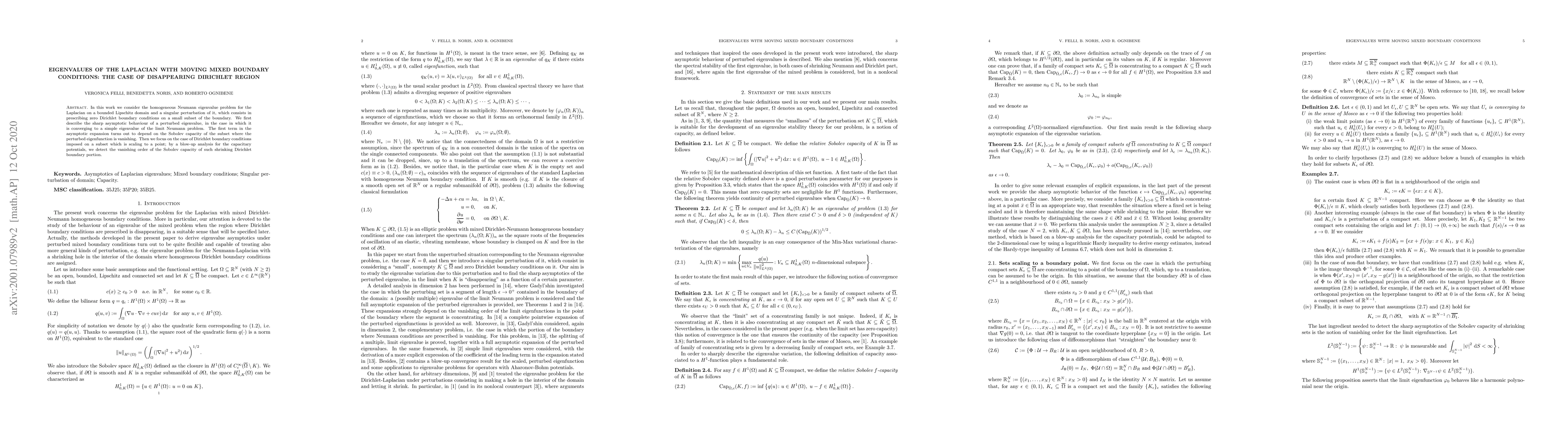 This paper investigates the eigenvalues of the Laplacian under Neumann boundary conditions perturbed by vanishing Dirichlet conditions on a small boundary subset. It examines the asymptotic behavior of perturbed eigenvalues and reveals that the first term in the expansion depends on the Sobolev capacity of the vanishing region, with a focus on the case where the Dirichlet region shrinks to a point.