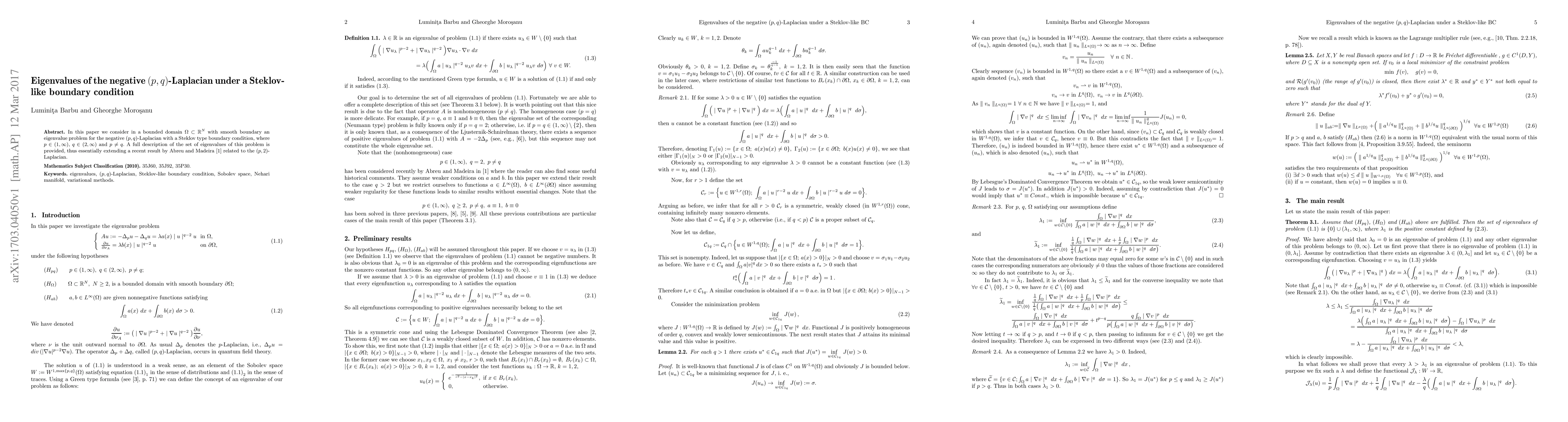 This paper investigates eigenvalues of the negative $(p,q)$-Laplacian in a bounded domain with a Steklov-like boundary condition, providing a complete description of the eigenvalue set and extending previous results on the $(p,2)$-Laplacian.