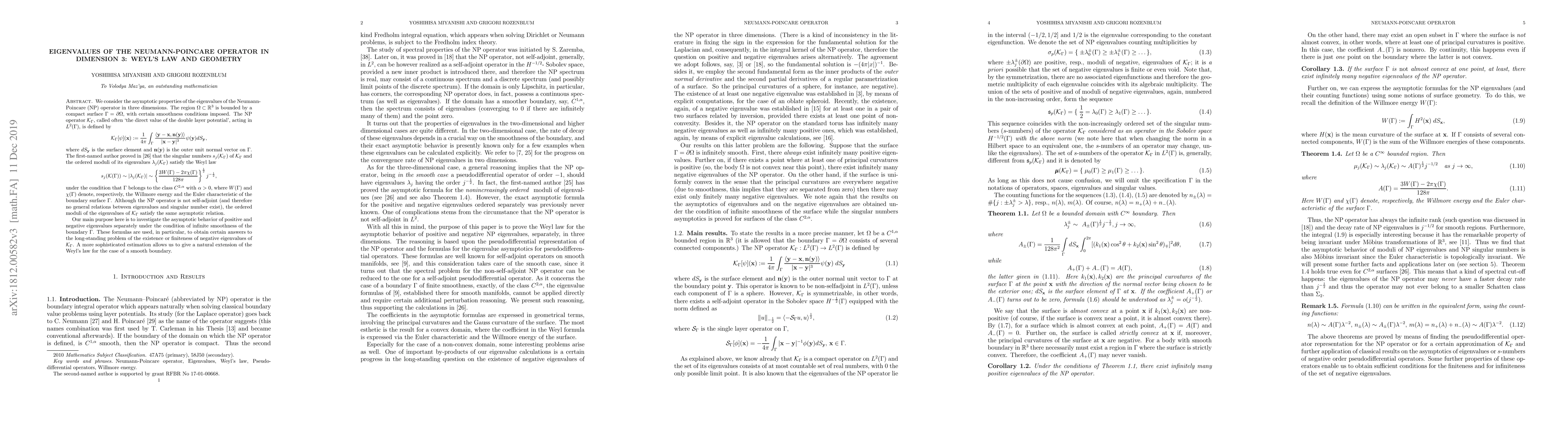 We consider the asymptotic properties of the eigenvalues of the Neumann-Poincare (NP) operator in three dimensions. The region $\Omega\subset \mathbb{R}^3$ is bounded by a compact surface $\Gamma=\partial \Omega$, with certain smoothness conditions imposed. The NP operator is defined by $ \mathcal{K}_{\Gamma}[\psi](\mathbf{x}):=\frac{1}{4\pi}\int_\Gamma\frac{\langle \mathbf{y}-\mathbf{x},\mathbf{n}(\mathbf{y})\rangle}{|\mathbf{x}-\mathbf{y}|^3}\psi(\mathbf{y})dS_{\mathbf{y}},$ where $dS_{\mathbf{y}}$ is the surface element and $\mathbf{n}(\mathbf{y})$ is the outer unit normal vector on $\Gamma$. The first-named author established earlier that the singular numbers $s_j(\mathcal{K}_{\Gamma})$ of $\mathcal{K}_{\Gamma}$ and the ordered moduli of its eigenvalues $\lambda_j(\mathcal{K}_{\Gamma})$ satisfy the Weyl law with coefficient expressed in geometric terms. Our main purpose here is to investigate the asymptotic behavior of positive and negative eigenvalues separately under the condition of infinite smoothness of the boundary $\Gamma$. These formulas are used, in particular, to obtain certain answers to the long-standing problem of the existence or finiteness of negative eigenvalues of $\mathcal{K}_{\Gamma}$.