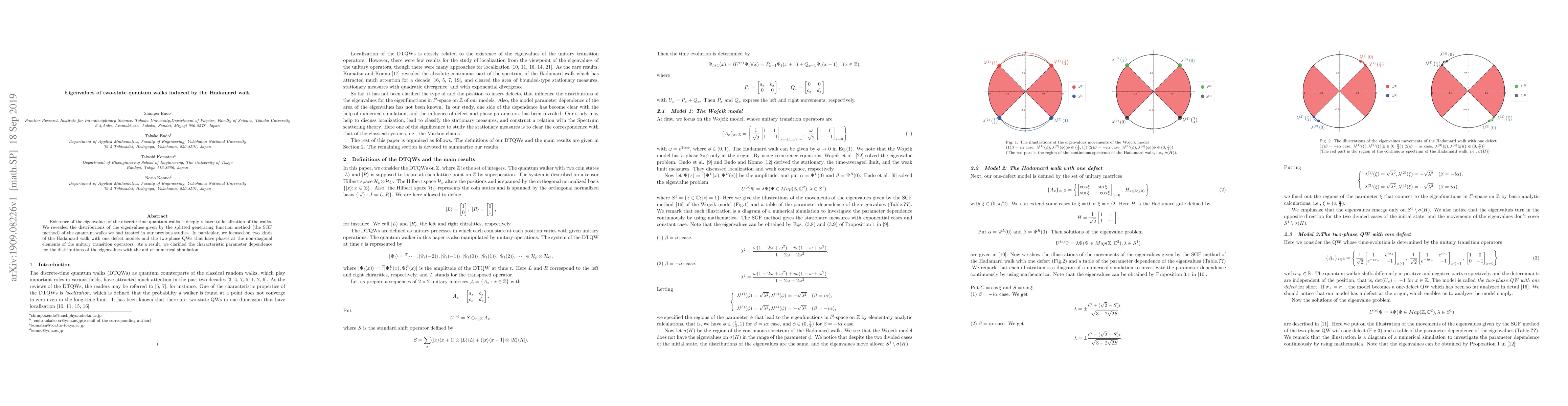 Existence of the eigenvalues of the discrete-time quantum walks is deeply related to localization of the walks. We revealed the distributions of the eigenvalues given by the splitted generating function method (the SGF method) of the quantum walks we had treated in our previous studies. In particular, we focused on two kinds of the Hadamard walk with one defect models and the two-phase QWs that have phases at the non-diagonal elements of the unitary transition operators. As a result, we clarified the characteristic parameter dependence for the distributions of the eigenvalues with the aid of numerical simulation.