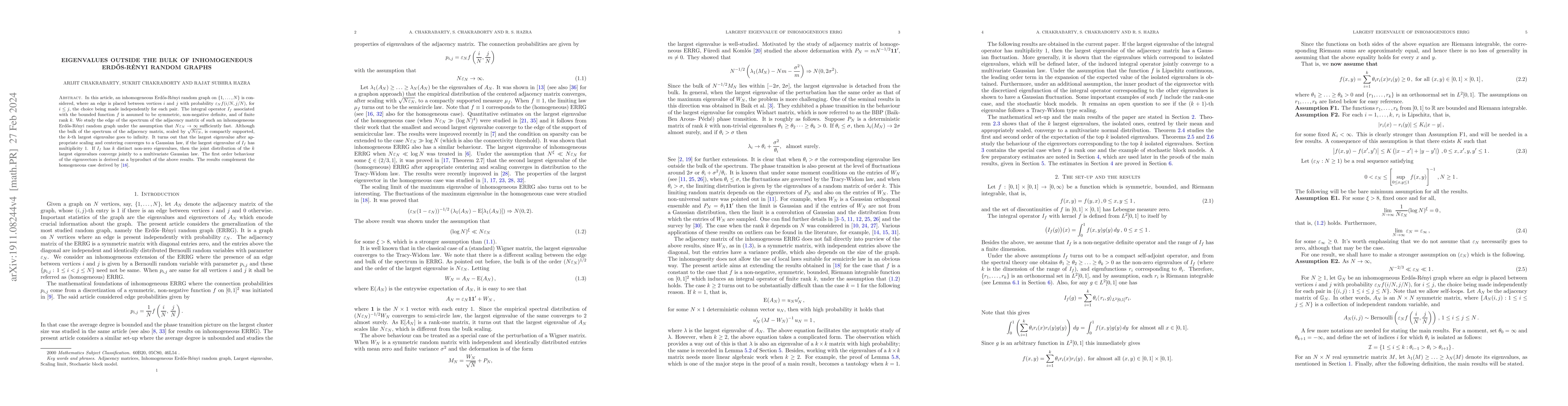 This paper investigates the eigenvalues of inhomogeneous Erdős-Rényi random graphs, showing that while the bulk spectrum is compact, the largest eigenvalue diverges to infinity. Under certain conditions, the largest eigenvalue converges to a Gaussian distribution, and the joint distribution of the largest k eigenvalues converges to a multivariate Gaussian law.