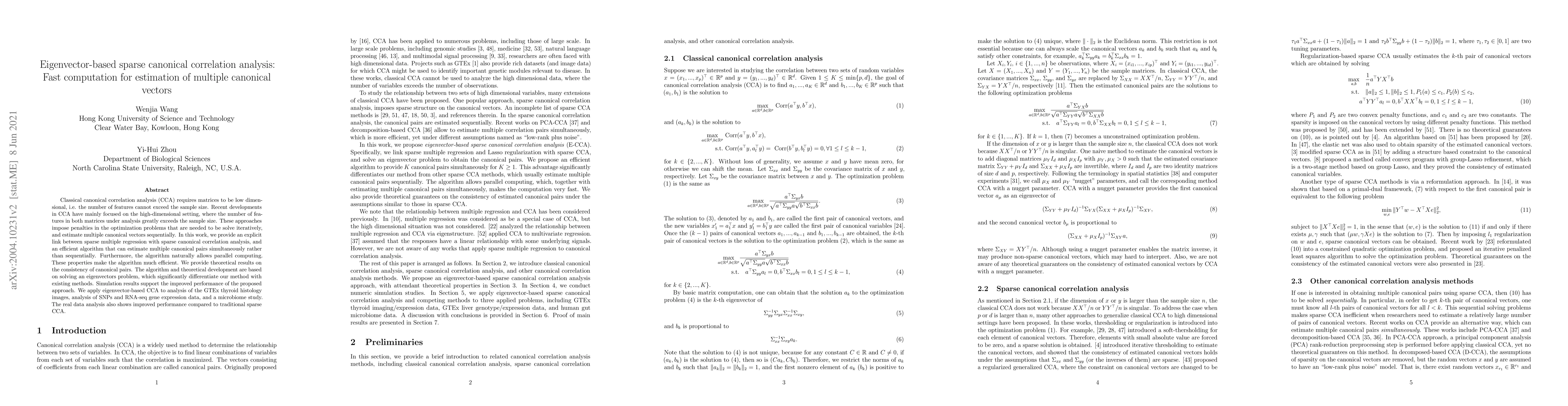 Classical canonical correlation analysis (CCA) requires matrices to be low dimensional, i.e. the number of features cannot exceed the sample size. Recent developments in CCA have mainly focused on the high-dimensional setting, where the number of features in both matrices under analysis greatly exceeds the sample size. These approaches impose penalties in the optimization problems that are needed to be solve iteratively, and estimate multiple canonical vectors sequentially. In this work, we provide an explicit link between sparse multiple regression with sparse canonical correlation analysis, and an efficient algorithm that can estimate multiple canonical pairs simultaneously rather than sequentially. Furthermore, the algorithm naturally allows parallel computing. These properties make the algorithm much efficient. We provide theoretical results on the consistency of canonical pairs. The algorithm and theoretical development are based on solving an eigenvectors problem, which significantly differentiate our method with existing methods. Simulation results support the improved performance of the proposed approach. We apply eigenvector-based CCA to analysis of the GTEx thyroid histology images, analysis of SNPs and RNA-seq gene expression data, and a microbiome study. The real data analysis also shows improved performance compared to traditional sparse CCA.