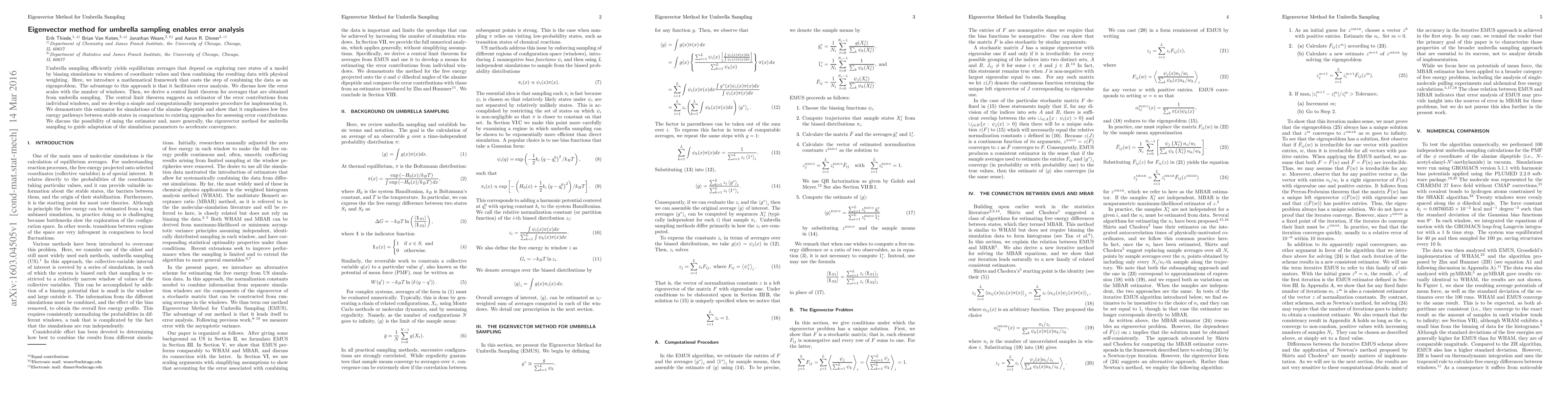 Umbrella sampling efficiently yields equilibrium averages that depend on exploring rare states of a model by biasing simulations to windows of coordinate values and then combining the resulting data with physical weighting. Here, we introduce a mathematical framework that casts the step of combining the data as an eigenproblem. The advantage to this approach is that it facilitates error analysis. We discuss how the error scales with the number of windows. Then, we derive a central limit theorem for averages that are obtained from umbrella sampling. The central limit theorem suggests an estimator of the error contributions from individual windows, and we develop a simple and computationally inexpensive procedure for implementing it. We demonstrate this estimator for simulations of the alanine dipeptide and show that it emphasizes low free energy pathways between stable states in comparison to existing approaches for assessing error contributions. We discuss the possibility of using the estimator and, more generally, the eigenvector method for umbrella sampling to guide adaptation of the simulation parameters to accelerate convergence.
