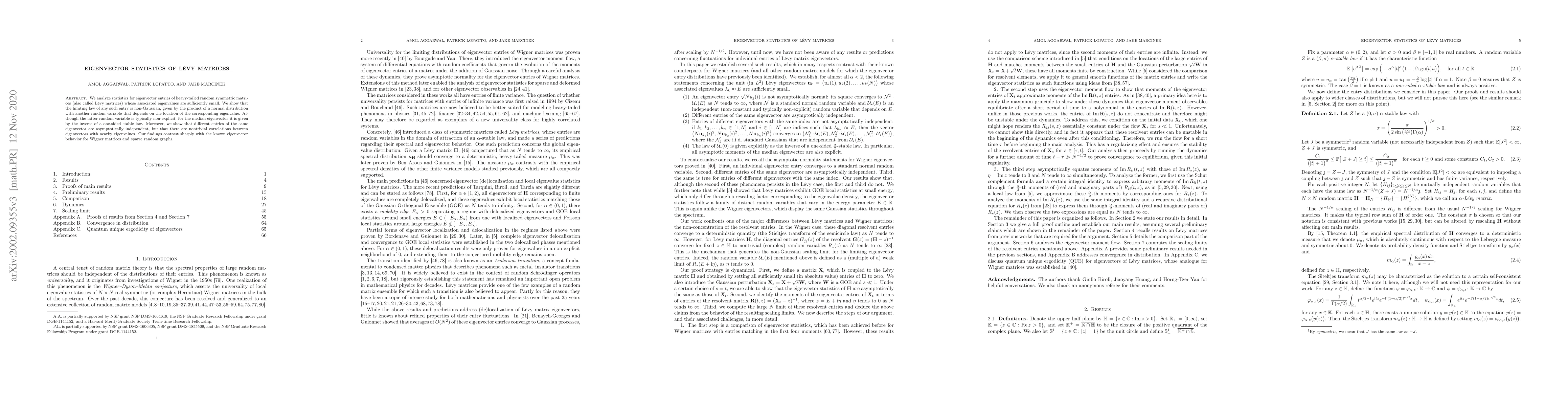 This paper investigates the eigenvector statistics of Lévy matrices, revealing non-Gaussian limiting distributions for eigenvector entries tied to small eigenvalues. It demonstrates that while entries within the same eigenvector are asymptotically independent, eigenvectors with close eigenvalues exhibit nontrivial correlations, contrasting with the behavior seen in Wigner matrices and sparse random graphs.