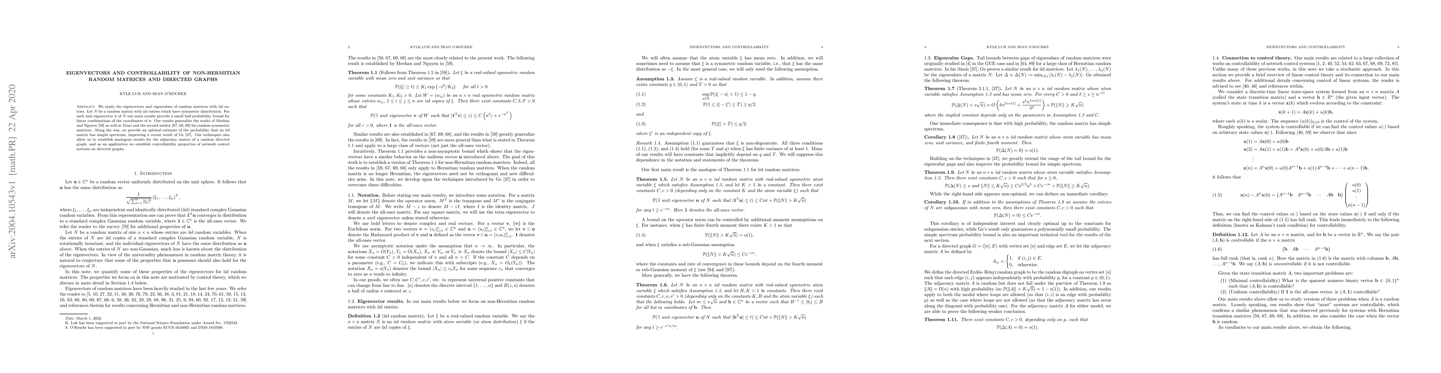 This paper investigates the eigenvectors and eigenvalues of non-Hermitian random matrices with independent and identically distributed entries, providing bounds for linear combinations of their coordinates. It also extends these results to random directed graphs, establishing controllability properties for network control systems.