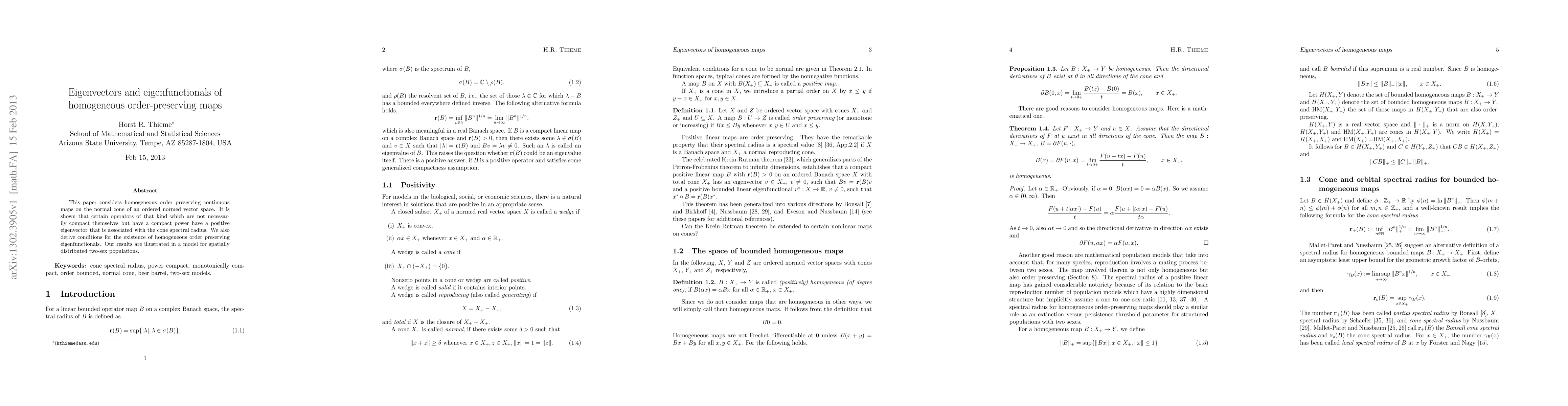 This paper investigates homogeneous order-preserving maps on the normal cone of an ordered normed vector space, proving the existence of positive eigenvectors associated with the cone spectral radius for certain non-compact operators with compact powers. It also provides conditions for homogeneous order-preserving eigenfunctionals, illustrated through a model of spatially distributed two-sex populations.