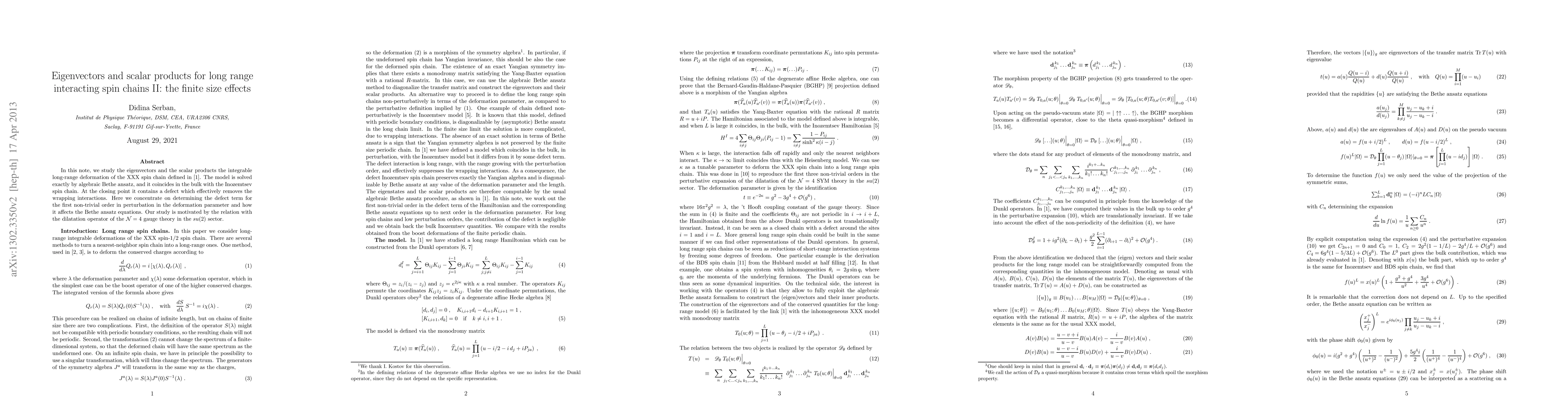 In this note, we study the eigenvectors and the scalar products the integrable long-range deformation of a XXX spin chain which is solved exactly by algebraic Bethe ansatz, and it coincides in the bulk with the Inozemtsev spin chain. At the closing point it contains a defect which effectively removes the wrapping interactions. Here we concentrate on determining the defect term for the first non-trivial order in perturbation in the deformation parameter and how it affects the Bethe ansatz equations. Our study is motivated by the relation with the dilatation operator of the N = 4 gauge theory in the su(2) sector.