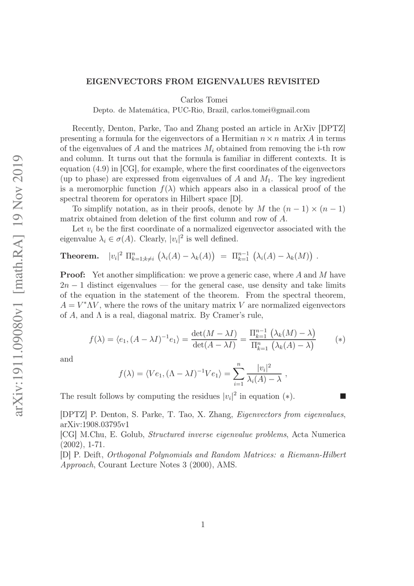 This is a remark on a recent post by P. Denton, S. Parke, T. Tao, X. Zhang, Eigenvectors from eigenvalues, arXiv:1908.03795v1
