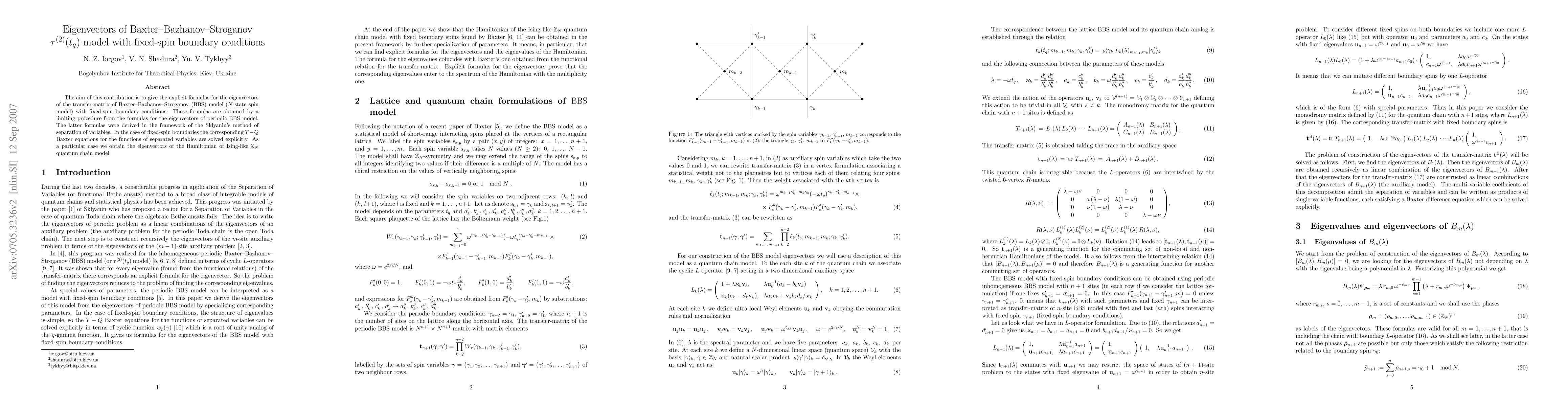 This paper provides explicit formulas for the eigenvectors of the Baxter-Bazhanov-Stroganov (BBS) model's transfer-matrix under fixed-spin boundary conditions, derived via a limiting procedure from periodic boundary conditions using Sklyanin's separation of variables method. The study also yields eigenvectors for the Ising-like Z_N quantum chain model as a special case.