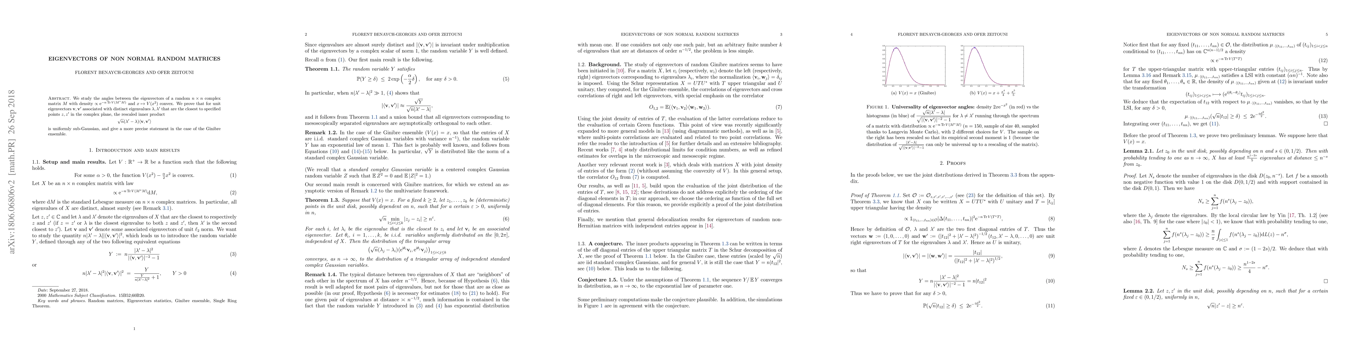 We study the angles between the eigenvectors of a random $n\times n$ complex matrix $M$ with density $\propto \mathrm{e}^{-n\operatorname{Tr}V(M^*M)}$ and $x\mapsto V(x^2)$ convex. We prove that for unit eigenvectors $\mathbf{v},\mathbf{v}'$ associated with distinct eigenvalues $\lambda,\lambda'$ that are the closest to specified points $z,z'$ in the complex plane, the rescaled inner product $$\sqrt{n}(\lambda'-\lambda)\langle\mathbf{v},\mathbf{v}'\rangle$$ is uniformly sub-Gaussian, and give a more precise statement in the case of the Ginibre ensemble.