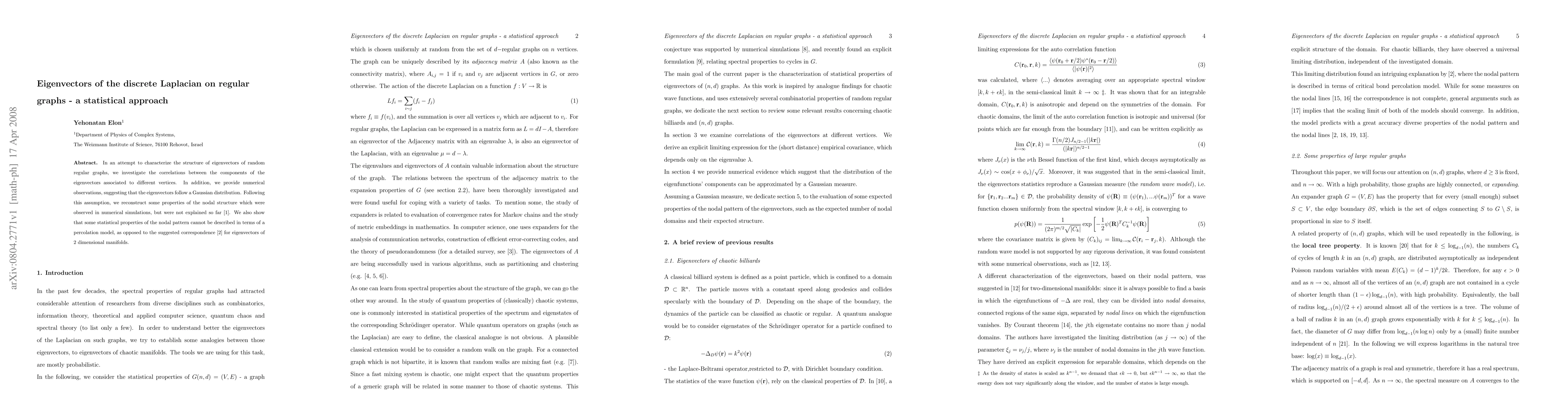 This paper explores the statistical properties of eigenvectors in random regular graphs, focusing on correlations between their components and suggesting a Gaussian distribution. It reconstructs nodal structure properties observed in simulations and refutes a percolation model correspondence for these eigenvectors.