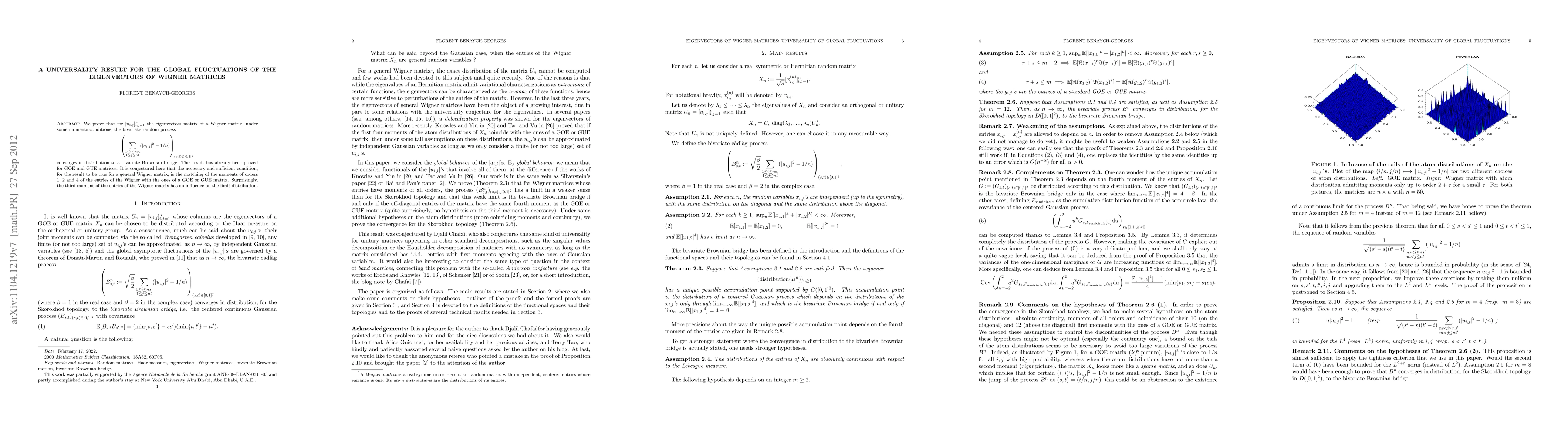 This paper proves that the global fluctuations of eigenvectors of Wigner matrices converge to a bivariate Brownian bridge under certain moments conditions, extending previous results to general Wigner matrices. It conjectures that the universality of this result relies on matching the first four moments of the matrix entries with those of GOE or GUE matrices, with the third moment being irrelevant.