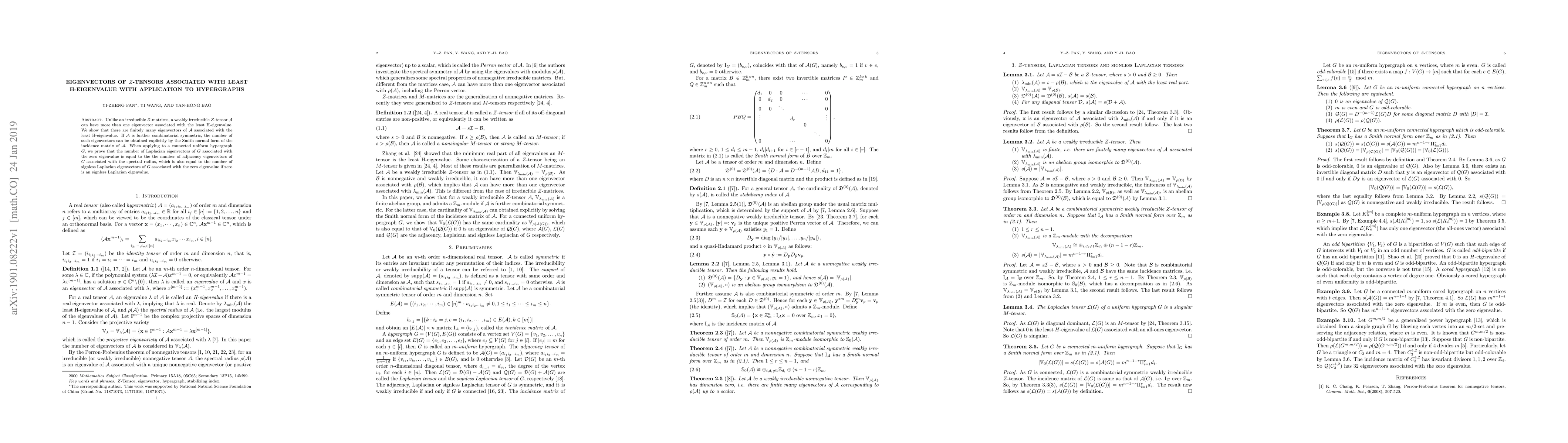 Unlike an irreducible $Z$-matrices, a weakly irreducible $Z$-tensor $\mathcal{A}$ can have more than one eigenvector associated with the least H-eigenvalue. We show that there are finitely many eigenvectors of $\mathcal{A}$ associated with the least H-eigenvalue. If $\mathcal{A}$ is further combinatorial symmetric, the number of such eigenvectors can be obtained explicitly by the Smith normal form of the incidence matrix of $\mathcal{A}$. When applying to a connected uniform hypergraph $G$, we prove that the number of Laplacian eigenvectors of $G$ associated with the zero eigenvalue is equal to the the number of adjacency eigenvectors of $G$ associated with the spectral radius, which is also equal to the number of signless Laplacian eigenvectors of $G$ associated with the zero eigenvalue if zero is an signless Laplacian eigenvalue.