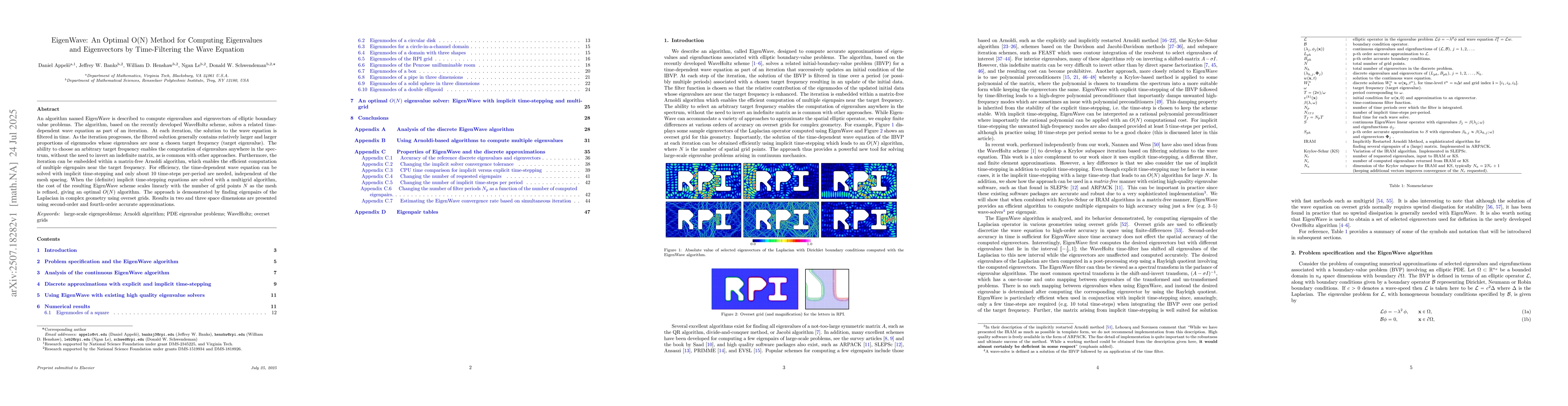 An algorithm named EigenWave is described to compute eigenvalues and eigenvectors of elliptic boundary value problems. The algorithm, based on the recently developed WaveHoltz scheme, solves a related time-dependent wave equation as part of an iteration. At each iteration, the solution to the wave equation is filtered in time. As the iteration progresses, the filtered solution generally contains relatively larger and larger proportions of eigenmodes whose eigenvalues are near a chosen target frequency (target eigenvalue). The ability to choose an arbitrary target frequency enables the computation of eigenvalues anywhere in the spectrum, without the need to invert an indefinite matrix, as is common with other approaches. Furthermore, the iteration can be embedded within a matrix-free Arnoldi algorithm, which enables the efficient computation of multiple eigenpairs near the target frequency. For efficiency, the time-dependent wave equation can be solved with implicit time-stepping and only about $10$ time-steps per-period are needed, independent of the mesh spacing. When the (definite) implicit time-stepping equations are solved with a multigrid algorithm, the cost of the resulting EigenWave scheme scales linearly with the number of grid points $N$ as the mesh is refined, giving an optimal $O(N)$ algorithm. The approach is demonstrated by finding eigenpairs of the Laplacian in complex geometry using overset grids. Results in two and three space dimensions are presented using second-order and fourth-order accurate approximations.