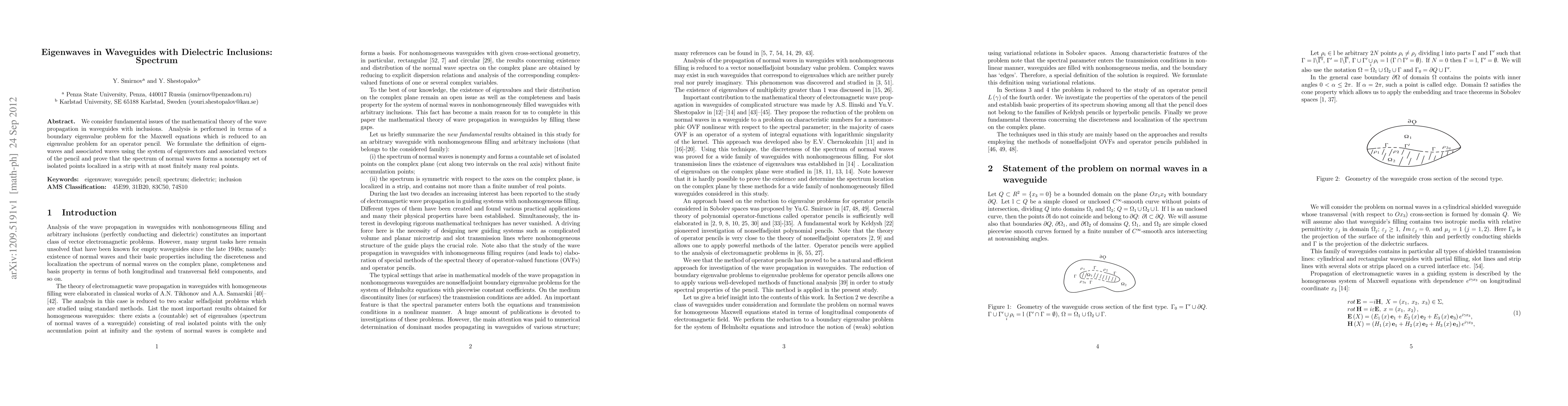 We consider fundamental issues of the mathematical theory of the wave propagation in waveguides with inclusions. Analysis is performed in terms of a boundary eigenvalue problem for the Maxwell equations which is reduced to an eigenvalue problem for an operator pencil. We formulate the definition of eigenwaves and associated waves using the system of eigenvectors and associated vectors of the pencil and prove that the spectrum of normal waves forms a nonempty set of isolated points localized in a strip with at most finitely many real points.