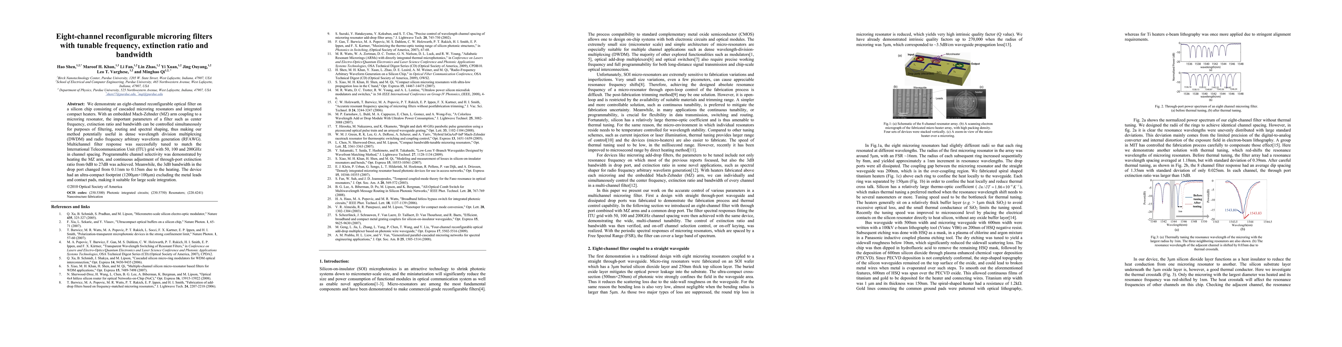 This paper presents an eight-channel reconfigurable optical filter on a silicon chip using cascaded microring resonators and integrated heaters, enabling simultaneous tuning of center frequency, extinction ratio, and bandwidth. The device demonstrates compatibility with ITU grid channel spacings and a compact footprint, making it suitable for dense wavelength division multiplexing and radio frequency arbitrary waveform generation.