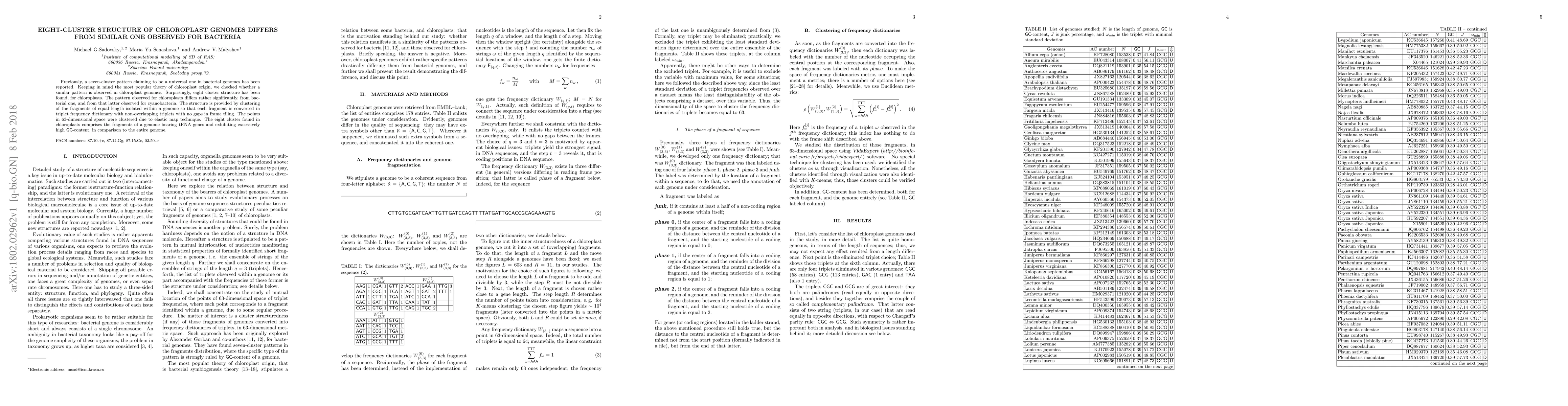 Previously, a seven-cluster pattern claiming to be a universal one in bacterial genomes has been reported. Keeping in mind the most popular theory of chloroplast origin, we checked whether a similar pattern is observed in chloroplast genomes. Surprisingly, eight cluster structure has been found, for chloroplasts. The pattern observed for chloroplasts differs rather significantly, from bacterial one, and from that latter observed for cyanobacteria. The structure is provided by clustering of the fragments of equal length isolated within a genome so that each fragment is converted in triplet frequency dictionary with non-overlapping triplets with no gaps in frame tiling. The points in 63-dimensional space were clustered due to elastic map technique. The eight cluster found in chloroplasts comprises the fragments of a genome bearing tRNA genes and exhibiting excessively high $\mathsf{GC}$-content, in comparison to the entire genome.